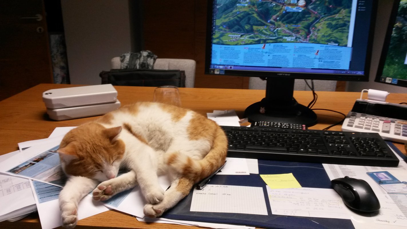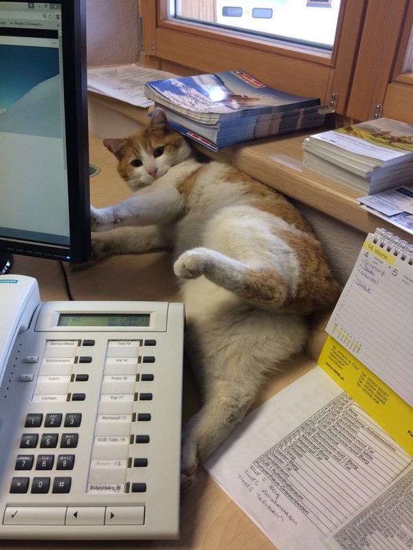 Zu Beginn hatte Charli jedoch kein leichtes Sein. Sein ständiges Hungergefühl, das immerwährende Bedürfnis nach Streicheleinheiten und sein Haarverlust waren vor allem dem männlichen Part des Teams ein Dorn im Auge. Hinzu kommt, dass Charli die dumme Angewohnheit besitzt, es sich auf jeden Schoß gemütlich zu machen, der ihm in die Quere kommt, und nicht alle BesucherInnen in unserem Büro damit eine Freude haben. Ein glücklicher Zufall hat die Ansicht in der Chefetage jedoch geändert: Bei einem Besuch in Wien wurde unser Geschäftsführer von einer Seilbahner-Kollegin gefragt, wie es denn unserer Lift-Katze gehe. Dass man Charli sogar in Wien kennt, dass überraschte auch unseren Chef, und zurück aus der Bundeshauptstadt hieß es: „Charli darf bleiben“!