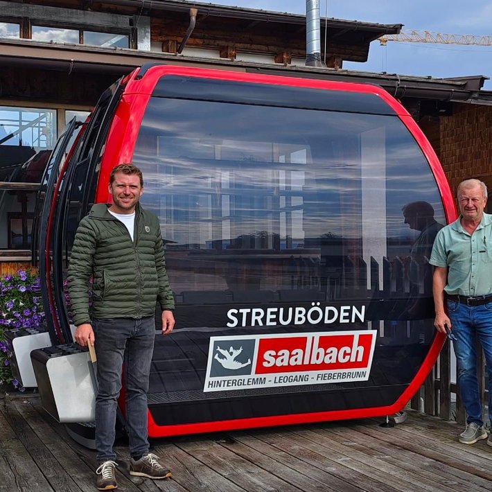 Um euch, allen Einheimischen und Gästen einen Vorgeschmack auf die neue Bahn zu geben, haben wir eine Ausstellungsgondel am Eingang zur jetzigen Talstation platziert. Die Geschäftsführer Sebastian Schwaiger und Martin Trixl haben die Gondel in Empfang genommen. Schaut vorbei und überzeugt euch selbst von der lässigen neuen roten Gondel mit komfortablen Sitzen und Panoramaverglasung!