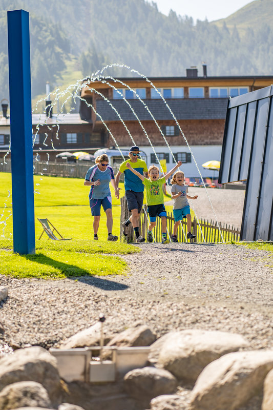 Bei der Gestaltung von Timoks Wasserspielen wurde ein regionales Thema aufgegriffen und anhand verschiedenfarbiger Steine die drei Fieberbrunner Achen Rotache, Weißache und Schwarzache eingebunden.