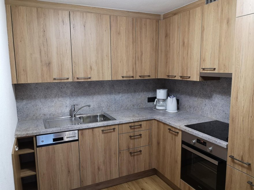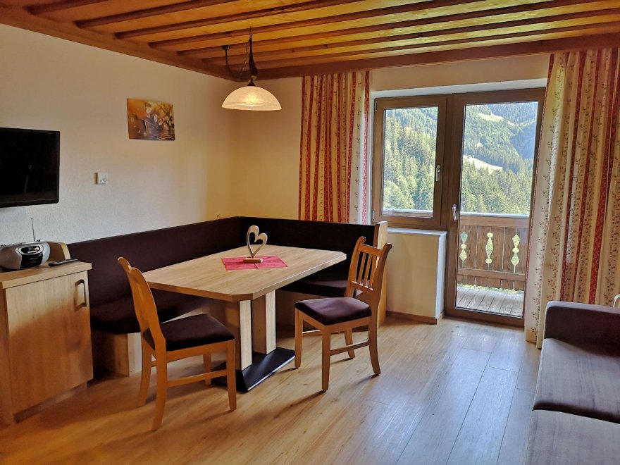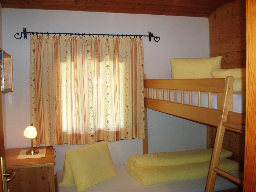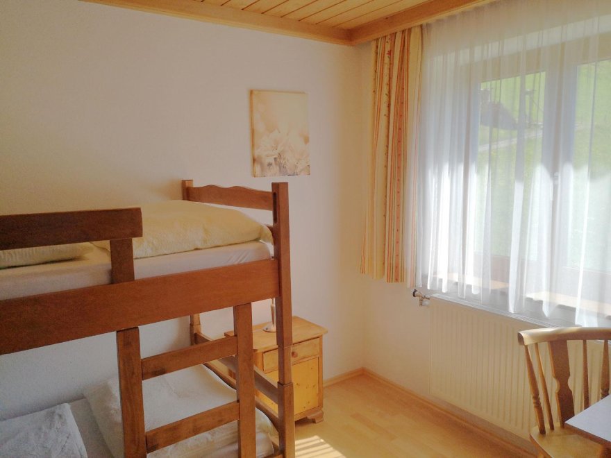 Gemütliche Ferienwohnung, 60 m², südseitig, bestehend aus: Vorraum (mit Garderobe, Schuhablage, Spiegel), WC, Dusche und Waschbecken, Wohnzimmer mit Sitzecke, Couch; Küche - Backrohr, Ceranfeld mit 4 Platten, Dunstabzug, Kühlschrank mit Gefrierfach, Toaster, Eierkocher, Mixer, Wasserkocher; Sat-TV, Radio, Schlafzimmer mit Doppelbett, Tisch und Stühle, Schrank; Kinderzimmer mit Stockbett, Tisch und Stühle, Schrank; Zusatzbett auf Anfrage; Kinderzimmer mit Verbindungstür zum Elternschlafzimmer