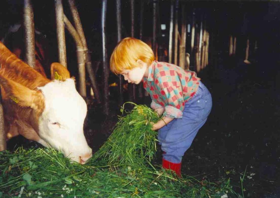 Mithilfe bei der Stallarbeit: Kälbchen füttern, unser Hühnerschar versorgen, Eier aus dem Nest holen, und unsere Katzen streicheln.