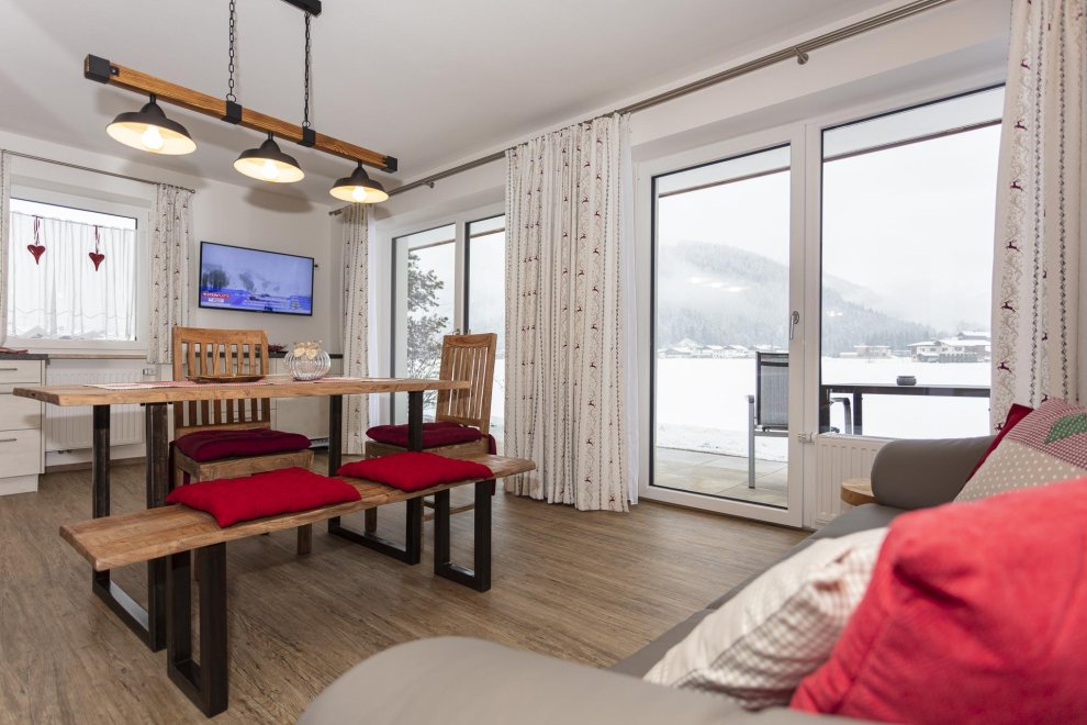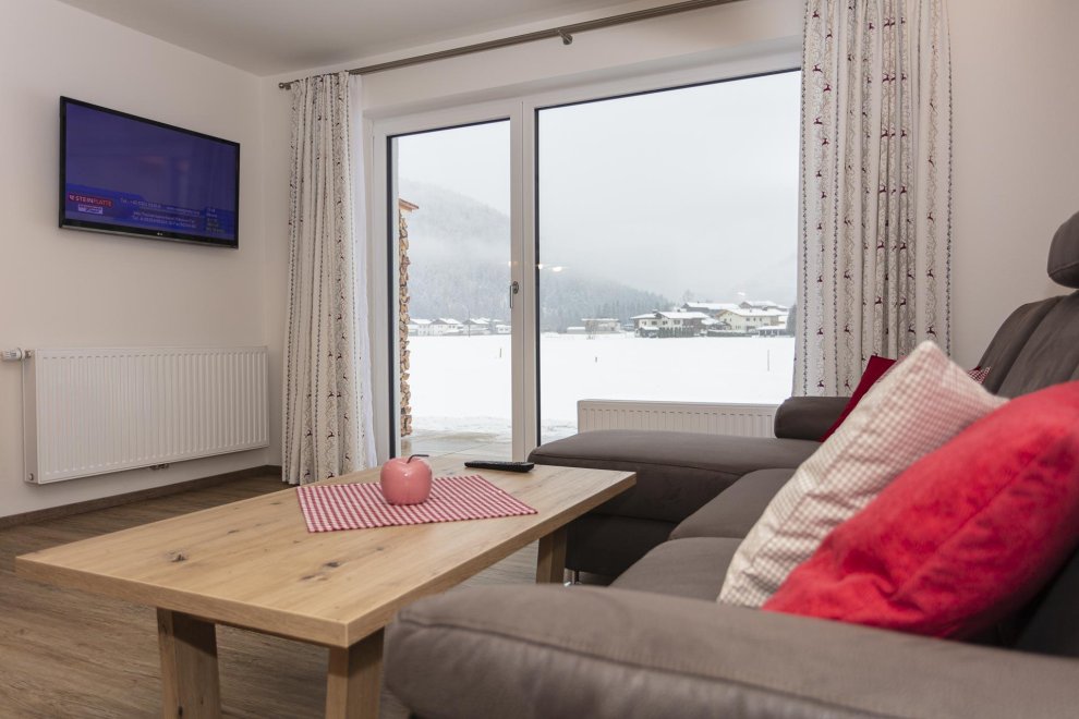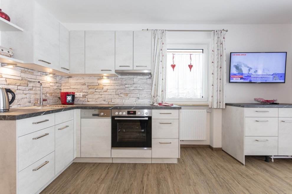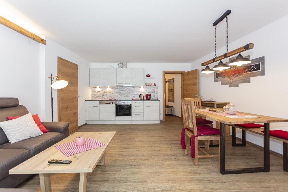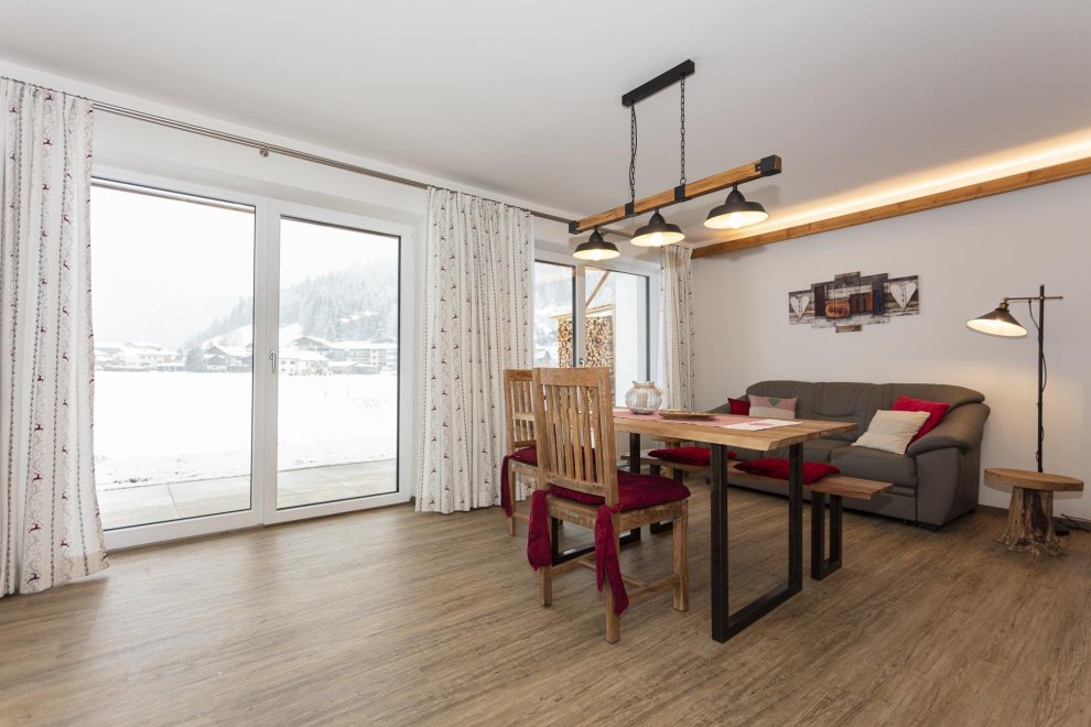 Die Ferienwohnung hat ein separates Schlafzimmer mit komfortablen Doppelbett, ein ausziehbares Sofa im Wohnbereich für eine zusätzliche Schlafmöglichkeit. In der top ausgestatteten Wohnküche finden Sie alles was Sie zum Kochen brauchen. (Geschirrspüler, Kaffeemaschine, Wasserkocher, Toaster und vieles mehr). Zusätzlich gehört zu jeder Ferienwohnung eine wunderschöne südseitig gelegene Terrasse und Liegewiese mit überwältigenden Ausblick auf die Kitzbüheler Alpenwelt.