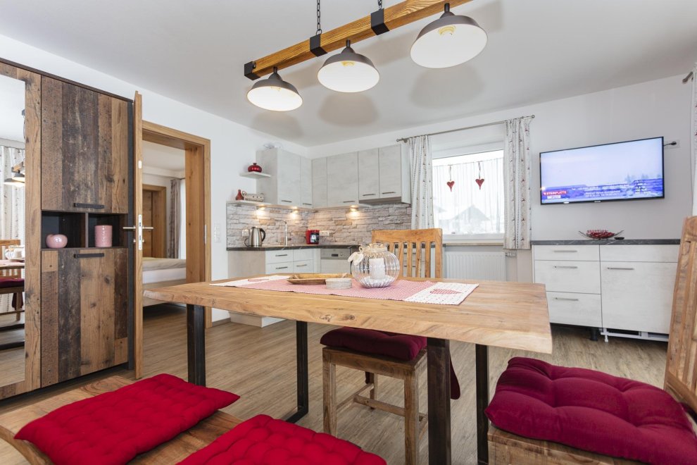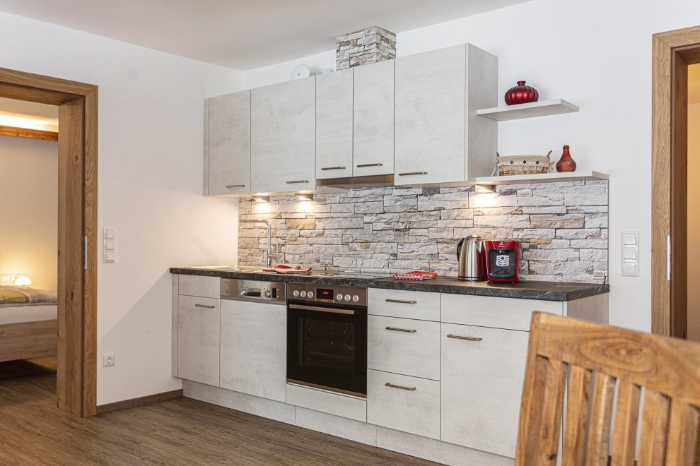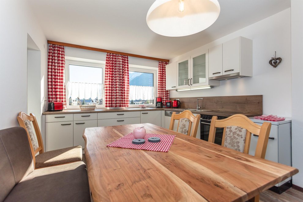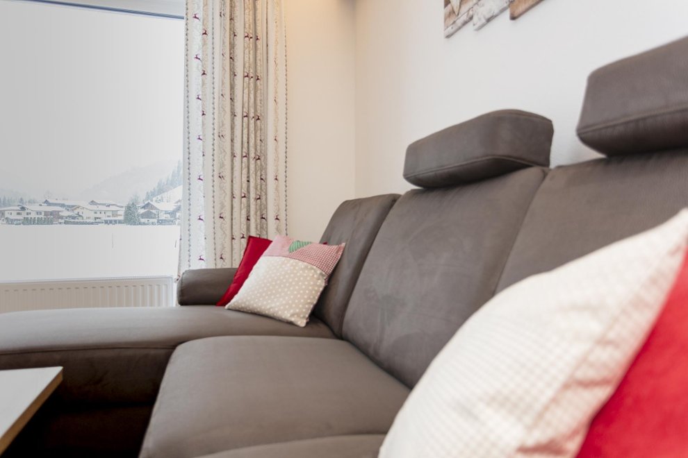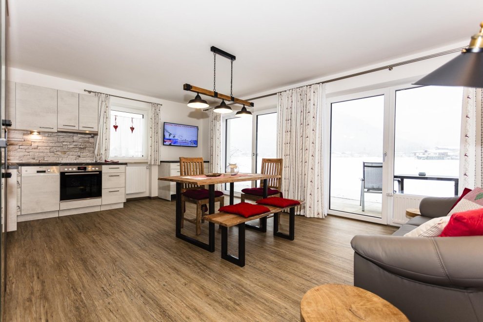 Die Ferienwohnung hat ein separates Schlafzimmer mit komfortablen Doppelbett, ein ausziehbares Sofa für eine weitere Schlafmöglichkeit für 2 Personen. In der top ausgestatteten Wohnküche finden Sie alles was Sie zum Kochen brauchen. (Geschirrspüler, Kaffeemaschine, Wasserkocher, Toaster und vieles mehr). Zusätzlich gehört zu jeder Ferienwohnung eine wunderschöne südseitig gelegene Terrasse und Liegewiese mit überwältigenden Ausblick auf die Kitzbüheler Alpenwelt.