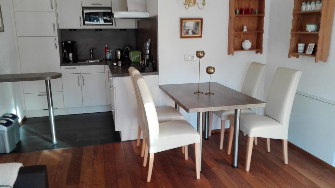 Gemütliche Wohnung mit einem Schlafzimmer mit Doppelbett und Platz für ein Zusatzbett, ein Badezimmer mit Badewanne, separater Dusche, Waschbecken und WC, einem Wohnraum mit kleiner Küche, einem Essplatz, und einer Wohnecke, Diele. Die Küche ist mit Kühlschrank, Mikrowellenherd, 2 Kochplatten, Kaffeemaschine, Wasserkocher, Geschirrspülmaschine, Geschirr, Gläser und Besteck für 4 Personen ausgestattet. Ein Garagenplatz steht zur Verfügung. 54 m² Wohnfläche.