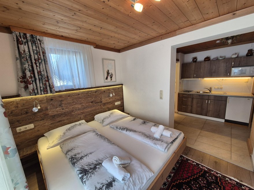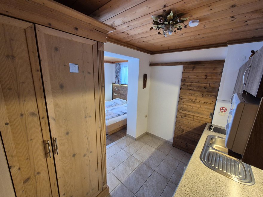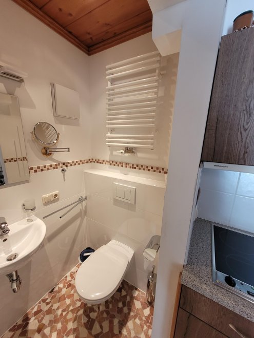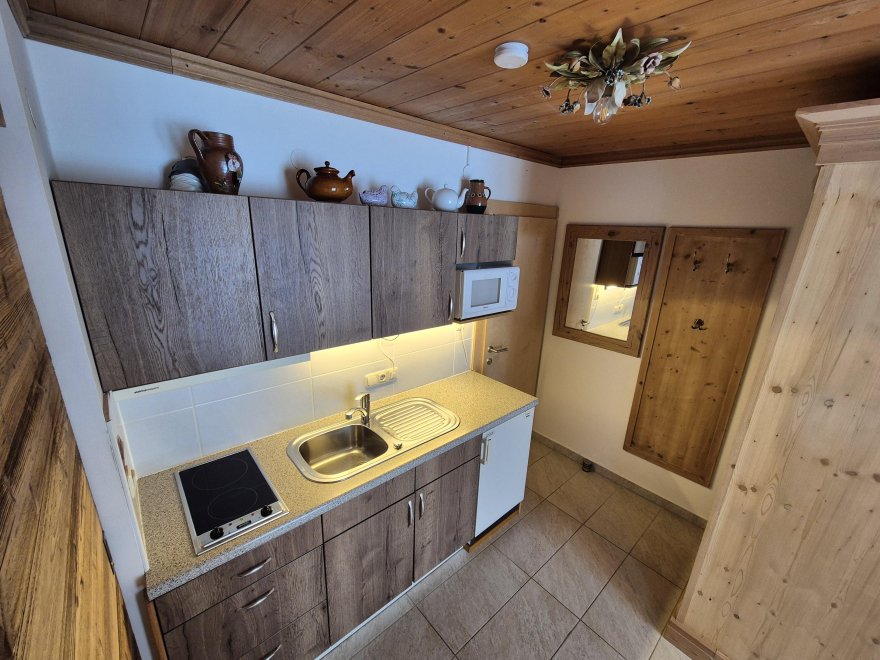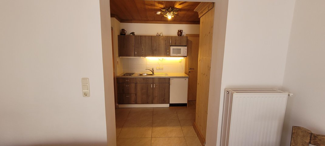 Nichtraucherwohnung für 1 bis 2 Personen, bestehend aus 1 Wohn- Schlafraum, Küchenzeile und Badezimmer mit DU/WC, Waschbecken und Kosmetikspiegel. Die beiden Räume sind miteinander verbunden, Badezimmer durch Schiebetür getrennt. Die Küchenzeile ist mit Waschbecken, Kochgelegenheit, Mikrowelle, Wasserkocher, Kaffeemaschine, kleinem Kühlschrank, Geschirr ausgestattet.