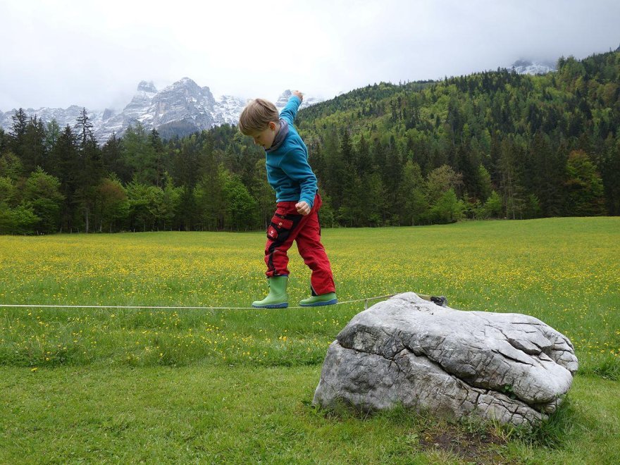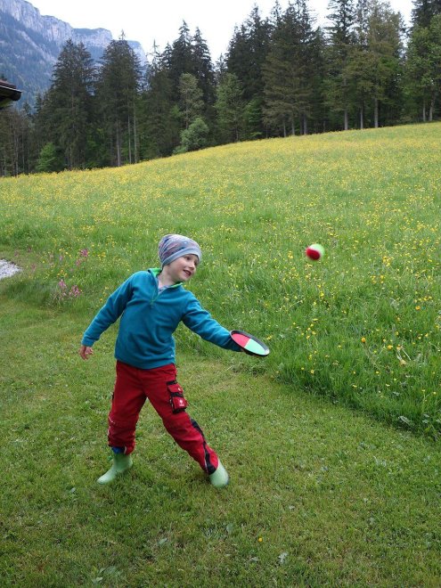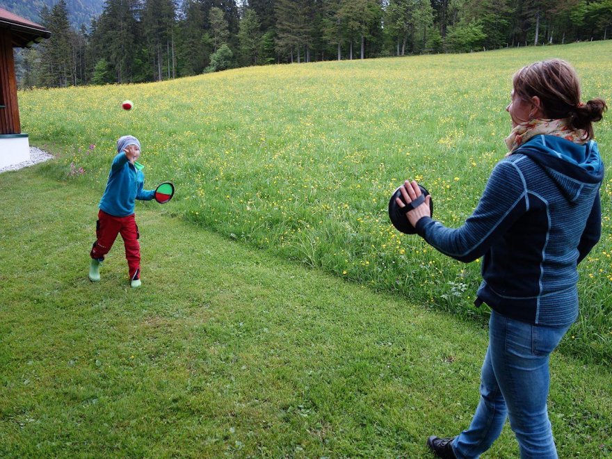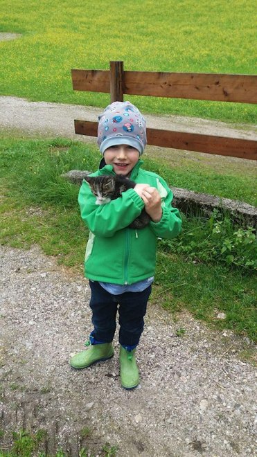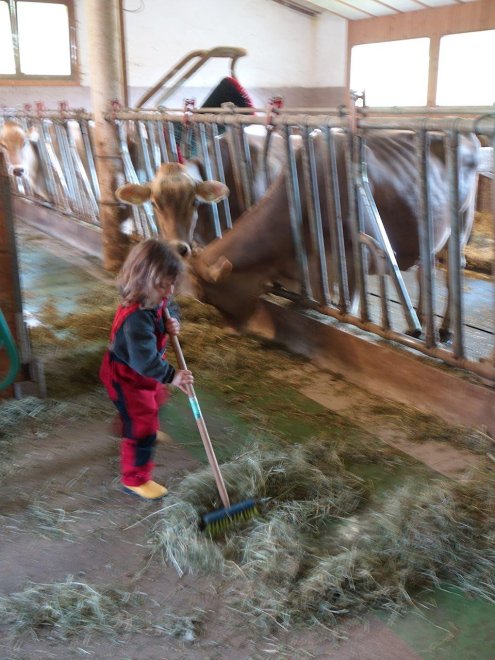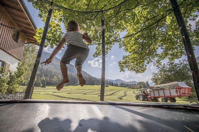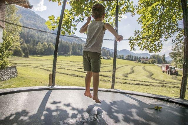 Kinderglück: Das Kinderlachen klingt leise vom Hof, es steht für die Kinder ein kleiner Spielplatz mit Schaukel, Sandkiste, 3m Trampolin, kleine Fahrzeuge, Slackline, Tischtennis und Winterrodelbahn zur Verfügung und die Kinder dürfen bei uns bei der Stallarbeit helfen und die Tiere streicheln.
