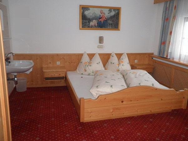 Geräumiges Zimmer mit Doppelbett, Tisch, Stühle, Schrank, Waschbecken, helle Holzmöblierung.