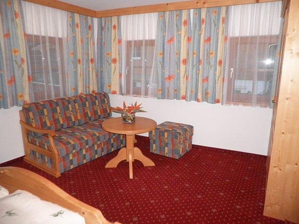 Geräumiges Zimmer mit Doppelbett, Ausziehcouch, Tisch, Stühle, Schrank, Waschbecken, rustikale Möblierung.