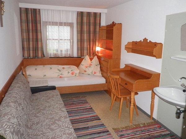 Geräumiges Einzelzimmer mit Einzelbett, Ausziehcouch, Schreibtisch mit Stühlen, Waschbecken, Schrank, rustikale Möblierung.