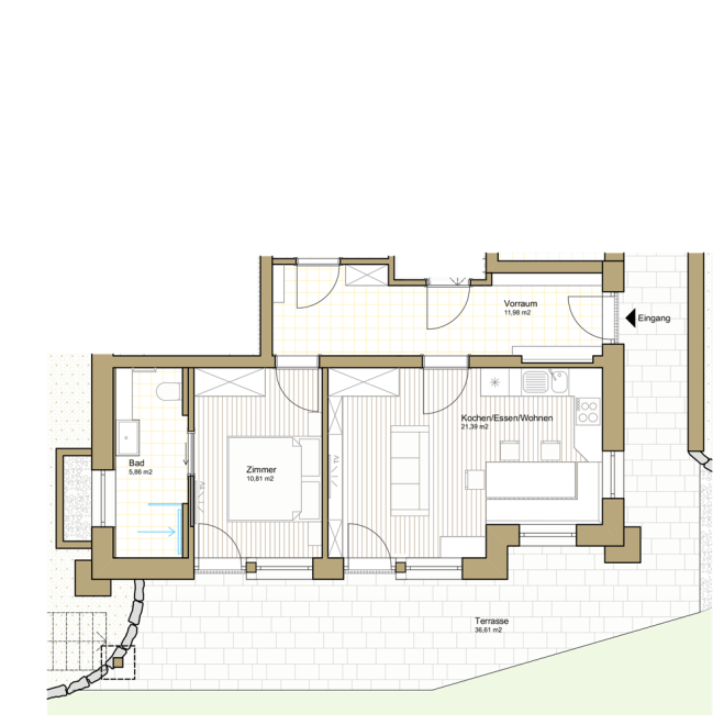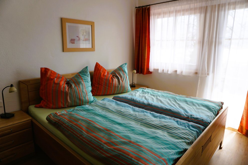 Die 50qm große Ferienwohnung mit serperatem Zugang umfasst ein Schlafzimmer, einen Wohn- und Essbereich mit ausziehbarer Doppelcouch und integrierter Küche, sowie ein Badezimmer mit Dusche und WC.