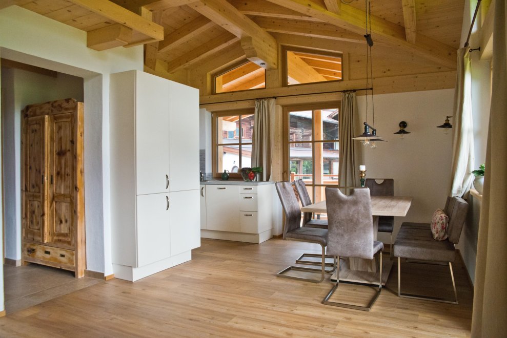 Die Ferienwohnungen verfügen über einen unverbauten Panoramablick direkt auf die Steinplatte und die Loferer-Steinberge und eine individuelle, moderne und gemütliche Ausstattung im alpenländischen Stil.