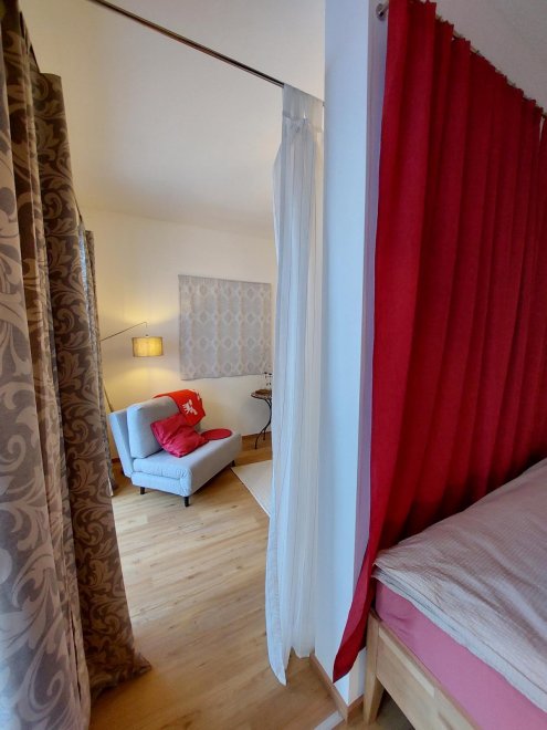 Das mit Liebe zum Detail eingerichtete Appartement im 2. Stock verfügt über eine voll ausgestattete Küche mit Essplatz. Das helle Wohnzimmer mit Balkon bietet Ihnen ein bequemes Sofa sowie Sitzgelegenheiten, die zum Lesen, Plaudern, Entspannen und Genießen oder Fernsehen einladen. Weiters finden Sie ein separates Schlafzimmer mit einem französischen Bett (140x200 cm) mit Balkon, einen Abstellraum, sowie ein helles und geräumiges Badezimmer. Der Balkon befindet sich auf der Westseite des Appartements.