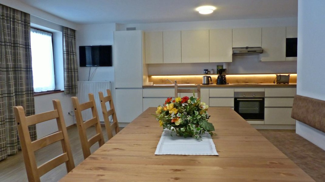 Unser Apartment Waidring mit Personenlift ist mit 2 Schlafzimmern für 2 Kleinfamilien mit je 1 Kind also für 6 Personen geeignet. Wir vermieten aber auch mit zusätzlichen Schlafzimmern diese Wohnung, da unsere Zimmer "Zweibettzimmer Saalachtal" und "Zwei- und Einbettzimmer Pillerseetal" direkt an die Wohnung angrenzen und daher dazu gebucht werden können. Sie verfügen jedes über DU/WC, 1Zusatzbett, Sitzgelegenheit, HDTV, LAN Anschluß, WLAN und Balkon. Die Küche ist für 12 Personen ausgestaltet.