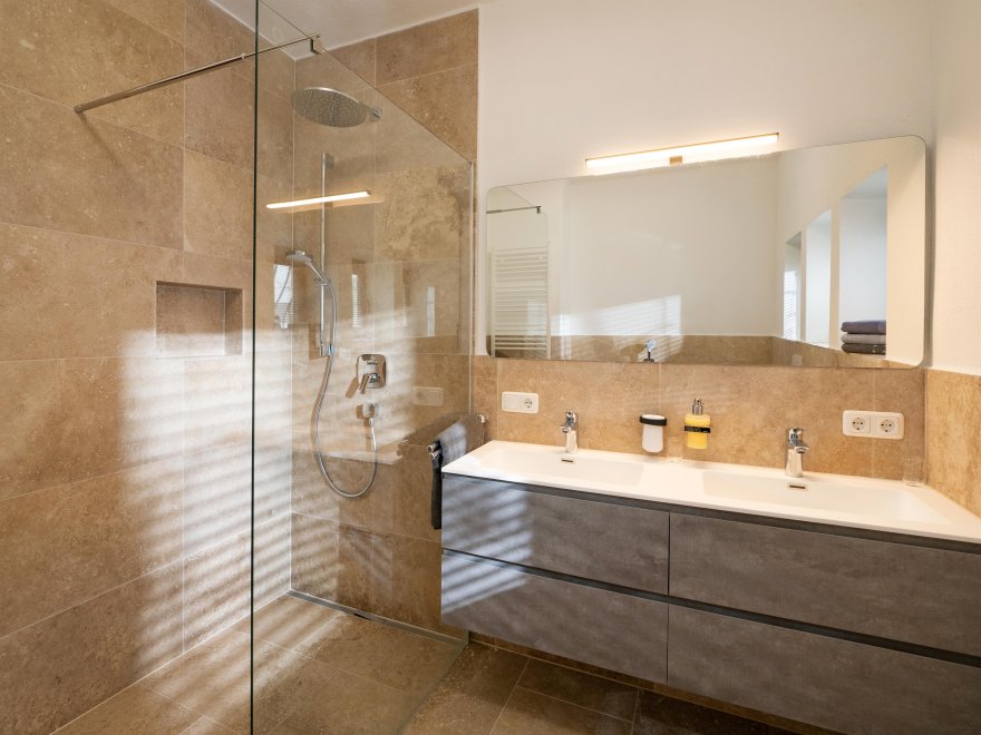 Ferienhaus für 2 - 10 Personen mit 3 Doppelbett Schlafzimmer - eines davon mit zusätzlicher ausziehbarer Couch, 1 Etagenbett Zimmer, 1 Vierbett - oder Familienzimmer, Küche, Wohnzimmer mit Wohnlandschaft auch zum schlafen, 2 Badezimmer mit Doppelwaschbecken, Duschen und Badewannen, 3 Toiletten, 1 Bidet, Föhn und Kosmetikspiegel.