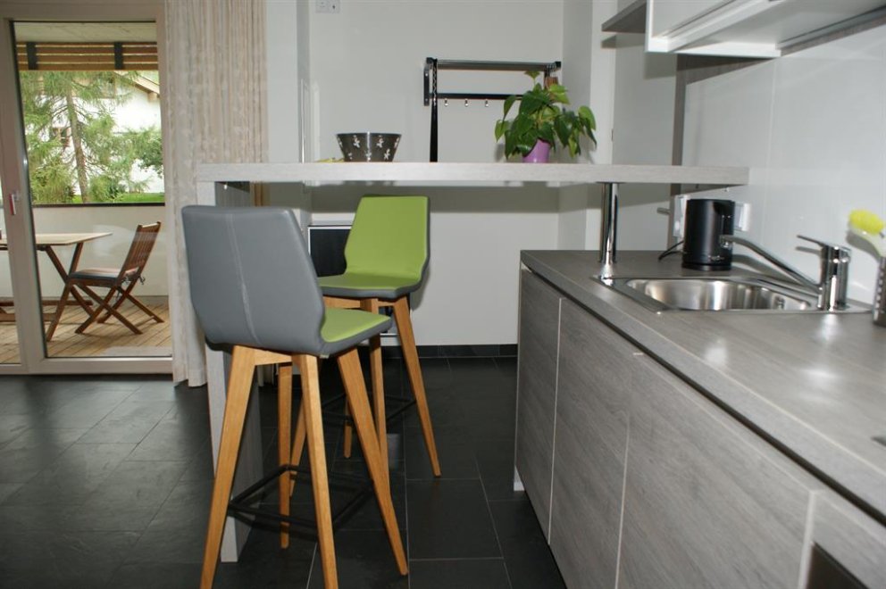 2-Zimmerwohnung mit 48 m²: Top ausgestattete Ferienwohnung mit gedeckter Terrasse und herrlicher Aussicht. Wohnküche mit Essecke, Wohnzimmer mit Sofabett (für 2 Personen), TV/Radio, W-Lan, Schlafzimmer mit Doppelbett, Badezimmer mit Dusche/WC.