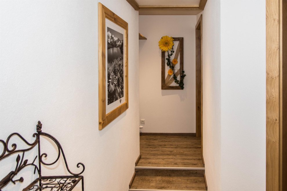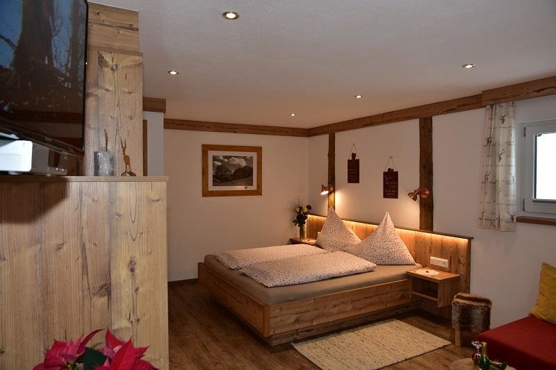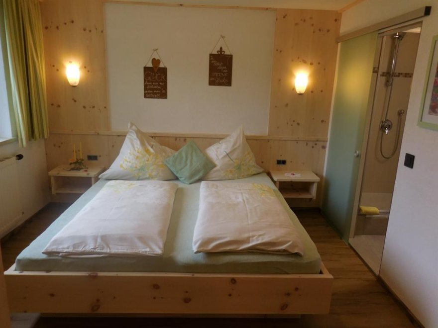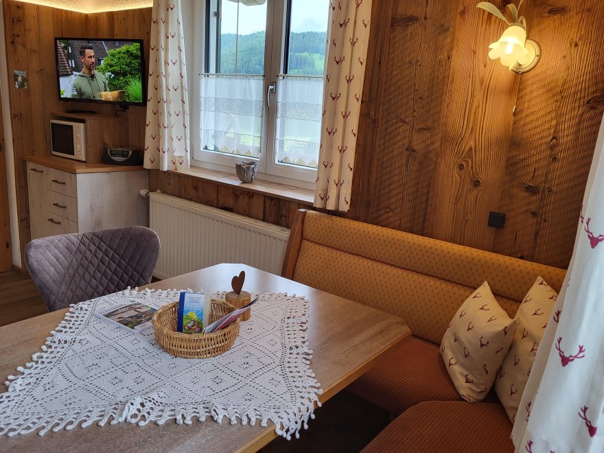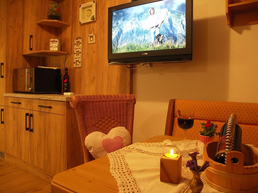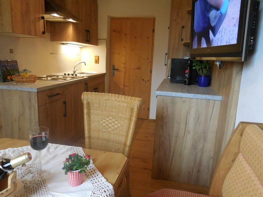 Dies ist eine 2-Zimmer Ferienwohnung mit einer gemütlichen Wohnküche mit Backofen, einer schönen Essecke mit Eckbank und SAT-TV - Flachbildschirm 32" sowie CD-Player. Das helle, freundliche Bad verfügt über eine Dusche und WC und das Schlafzimmer ist liebevoll eingerichtet mit einem Doppel- und Einzelbett in Zirbenholz. Der große Balkon mit herrlichem Bergpanoramablick ist ausgestattet mit schöner Holztischgruppe, Liegestuhl und Wäscheständer.