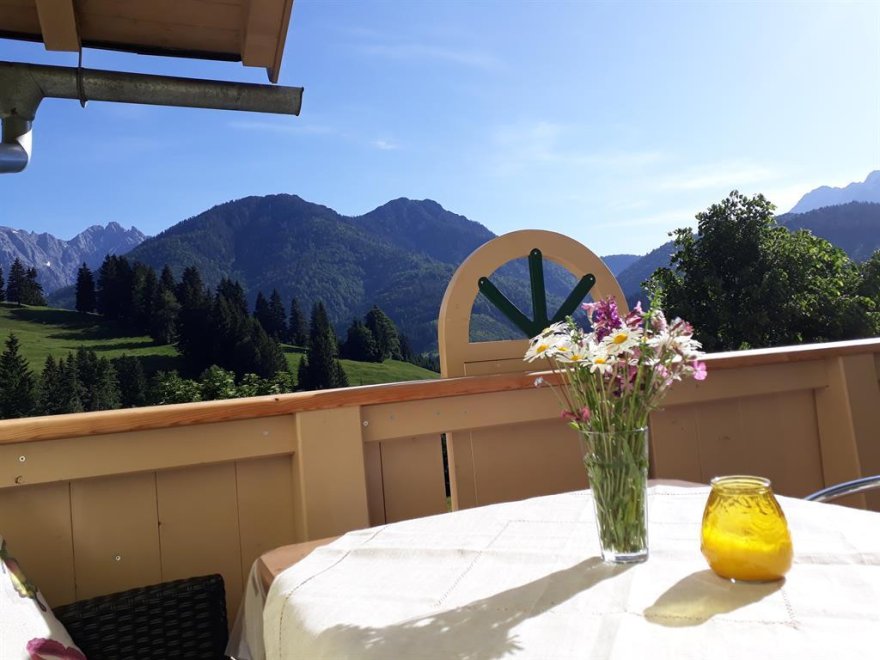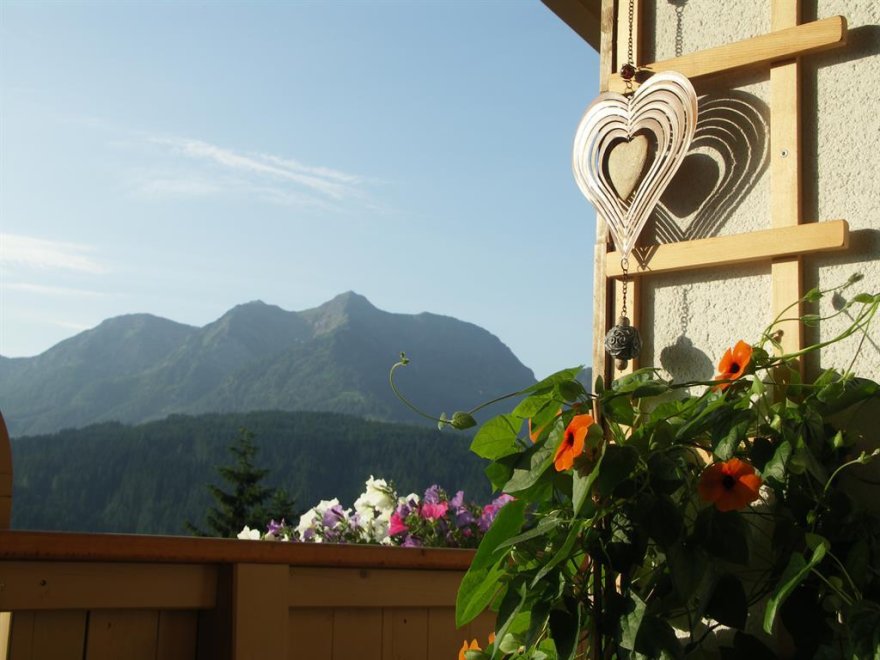 Es erwartet Sie eine sonnige, helle 2-Zimmer Ferienwohnung. Sie ist ost- und südseitig gelegen mit großem umlaufenden Balkon und einzigartigem Berg- und Panoramablick.
