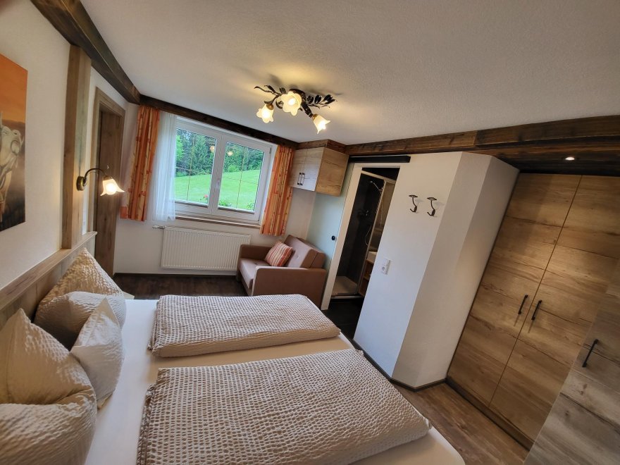 Im Schlafzimmer befinden sich ein Doppelbett und ein Einzelausziehbett bzw. bei Bedarf auch Gitterbett.Ausstattung Zimmer/Appartement