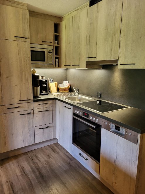 Dies ist eine 2-Zimmer Ferienwohnung mit einer gemütlichen Wohnküche mit Backofen, einer schönen Essecke mit Eckbank und SAT-FLAT-TV. Das helle, freundliche Bad verfügt über eine Dusche und WC und das Schlafzimmer ist liebevoll eingerichtet mit Zirbenholzmöbeln mit einem Doppelbett und Einzelausziehbett. Der große Balkon mit herrlichem Bergpanoramablick ist ausgestattet mit schönem Holztisch, Stühlen, Liegestuhl und Wäscheständer.