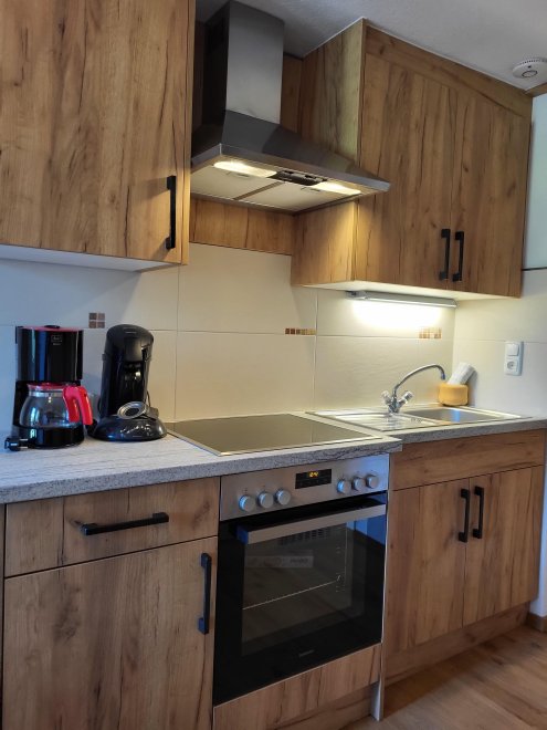 Die helle Wohnküche ist ausgestattet mit einer neuen Küchenzeile mit Backofen und großem Holztisch mit Eckbank sowie gemütlicher Ausziehcouch zum Fernsehen und Lesen (FLAT-SAT-TV, CD-Player).