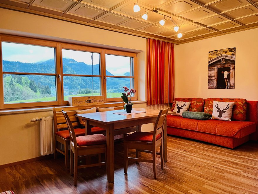 Gemütliche, neu eingerichtete Ferienwohnung mit geräumiger Wohnküche, Wohnzimmer mit ausziehbarer Doppelcouch für 2 Personen, großem Esstisch, SAT-TV, heimeliger Kachelofen. 1 Schlafzimmer mit Doppelbett und SAT-TV, 1 Schlafzimmer mit Doppelbett, Dusche / WC, seperates WC. Große Sonnenterrasse. 85m².