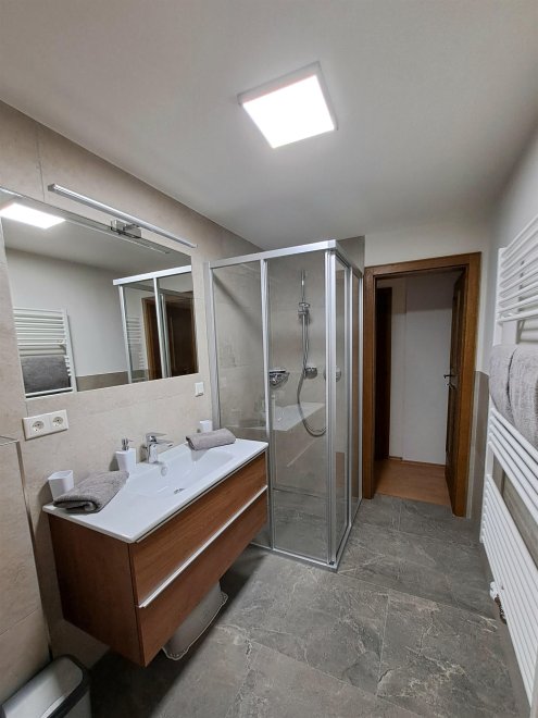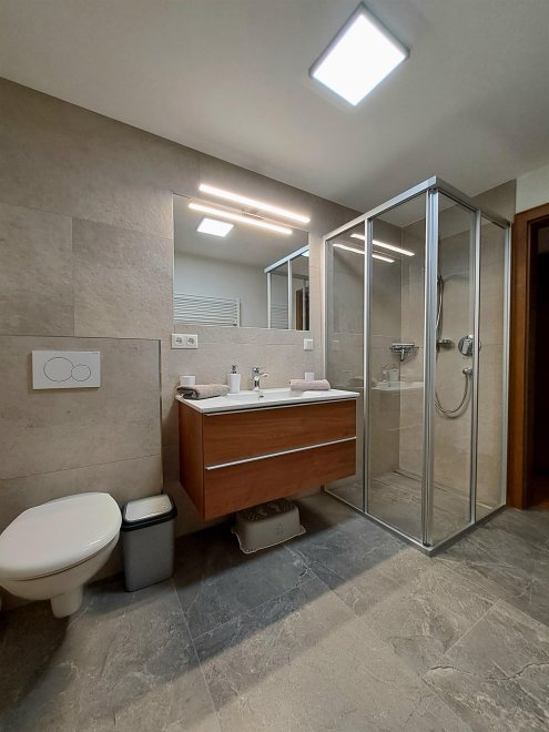 - 1 Schlafzimmer mit Dusche/Badewanne und WC – Doppelbett und Zusatzbett