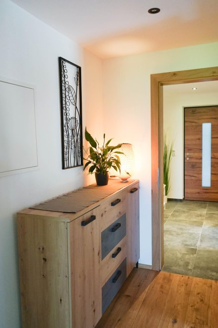 Unsere neu erbauten Ferienwohnung hat eine Größe von ca. 74 m² und verfügt über zwei gemütliche Schlafzimmer. Das erste Schlafzimmer ist mit einem komfortablen Doppelbett ausgestattet und verspricht erholsame Nächte. Ein robustes Etagenbett und eine praktische Ausziehcouch - ideal für Kinder oder Freunde - finden Sie im zweiten Schlafzimmer. Herzstück der Wohnung ist die geräumige Wohnküche. Hier können Sie an der voll ausgestatteten Küchenzeile leckere Mahlzeiten zubereiten und im einladenden Essbereich genießen. Eine zusätzliche Schlafcouch im Wohnbereich bietet weiteren Platz zum Übernachten. Der Balkon lädt zum Verweilen ein. Beginnen Sie den Tag mit einem Kaffee in frischer Alpenluft oder lassen Sie den Abend bei einem Glas Wein mit Blick auf die beeindruckende Bergwelt ausklingen.