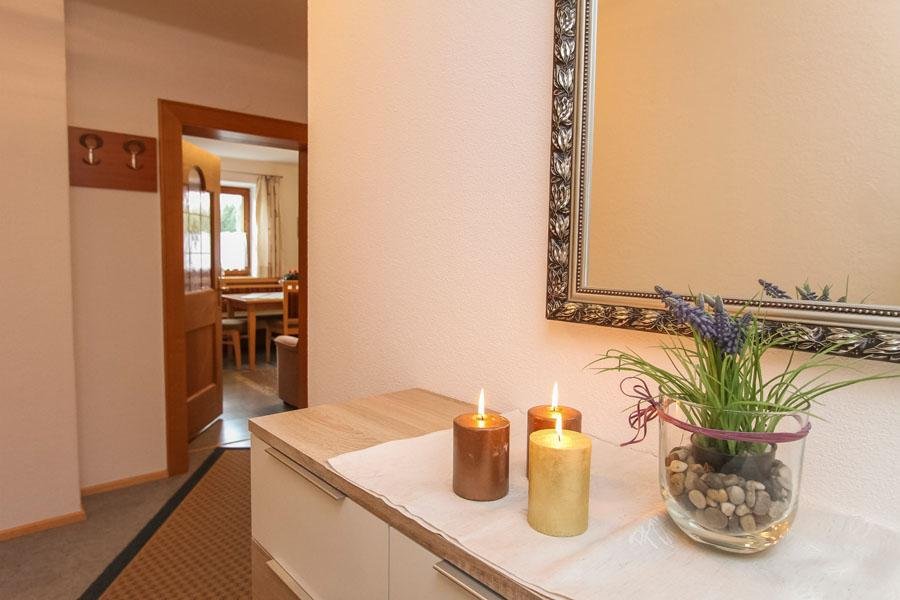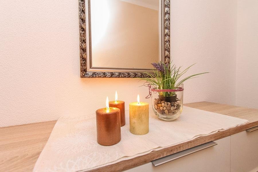 Für 4 Personen eignet sich unsere gemütliche Ferienwohnung, mit 2 getrennten Doppelzimmern, einem Badezimmer/WC. Im Wohnraum mit TV, fühlt man sich heimelig und die Sitzecke eignet sich nicht nur als Essplatz, sondern auch für ein geselliges Beisammensein. Die Küche ist mit einem Kühlschrank mit Gefrierfach, Einbauherd mit 4 Cerankochzonen, Dunstabzug, Wasserkocher, Kaffeemaschine und Toaster ausgestattet. Auf eine kleine Terrasse mit angrenzender Grünfläche gelangt man über eines der Schlafzimmer.