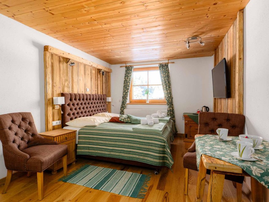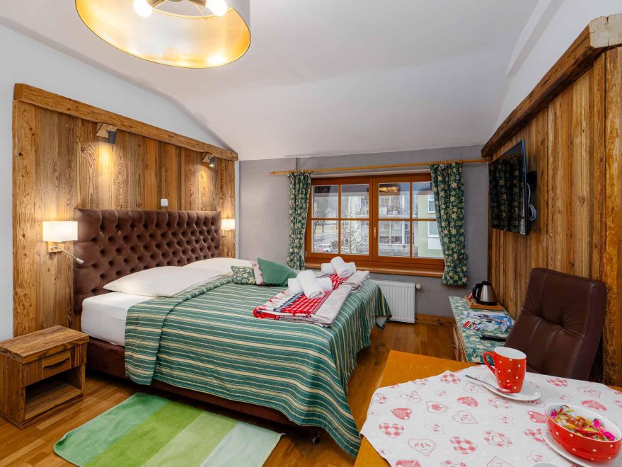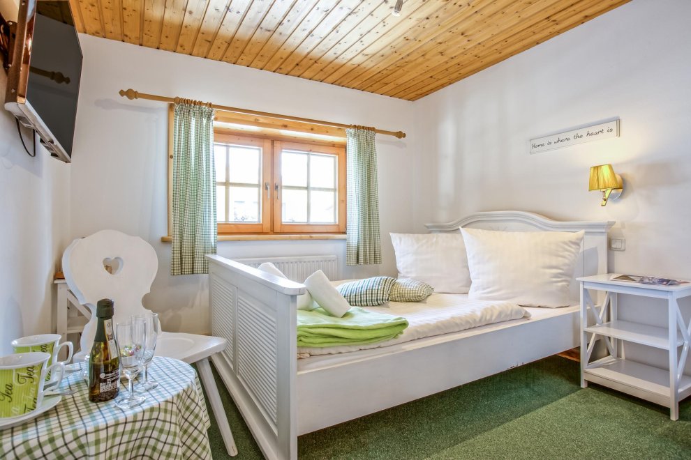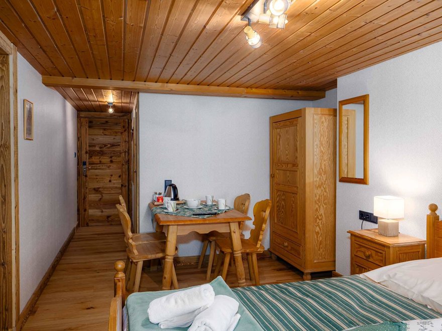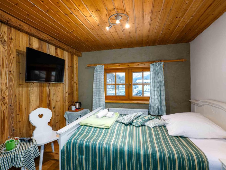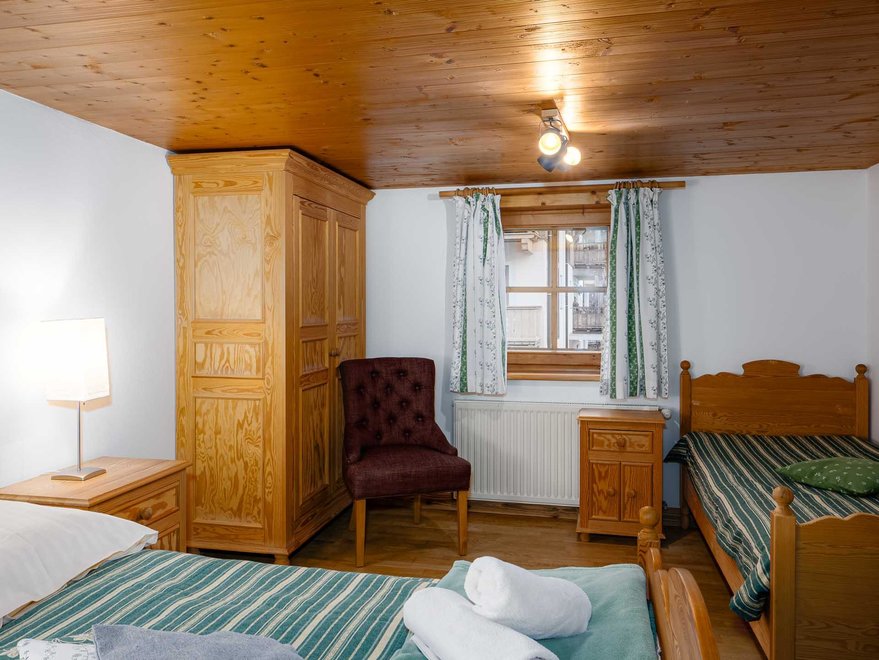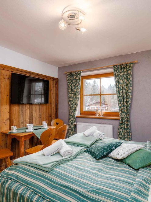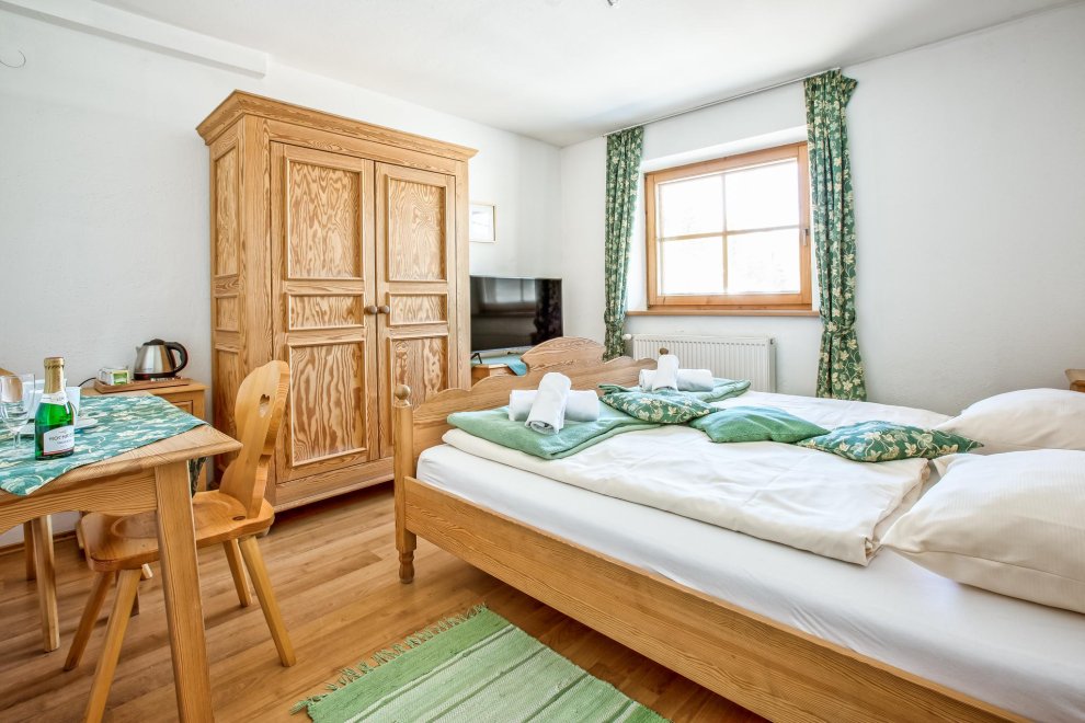 Zimmer mit Doppelbett, Zusatzbett, Tisch und Stühle, Dusche/Wc, Kabel-TV, Internetanschluss (W-LAN).