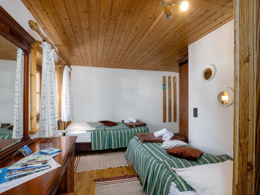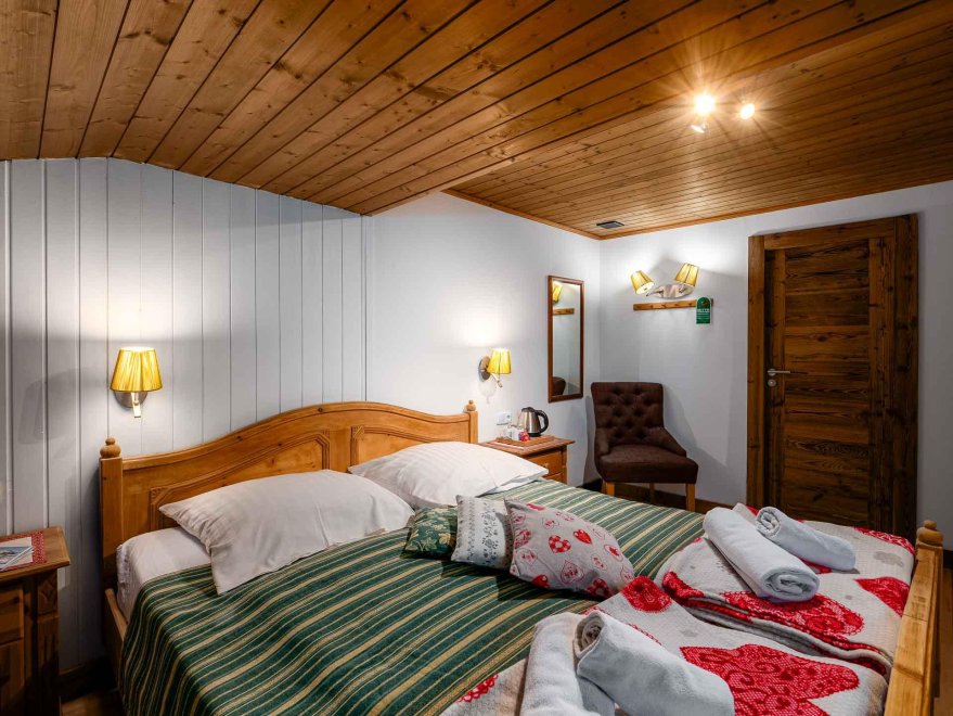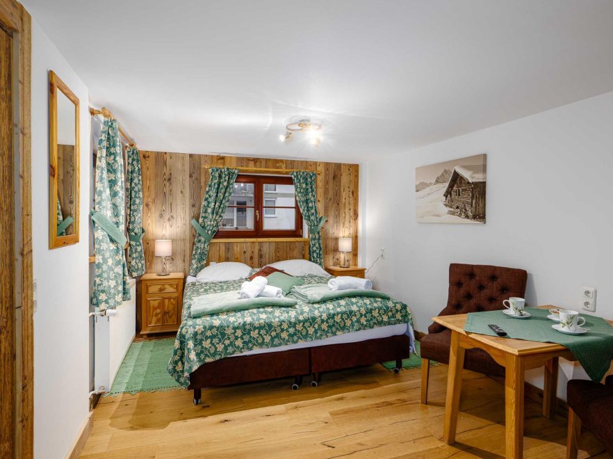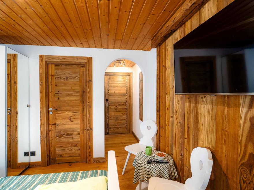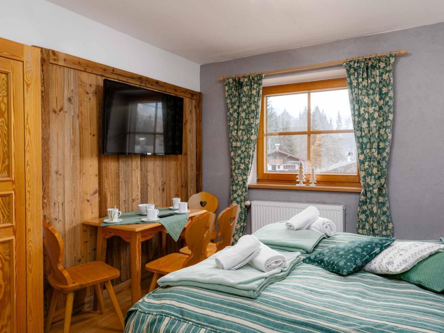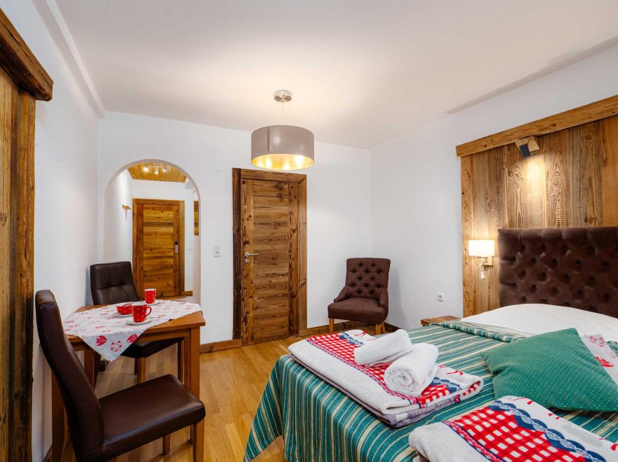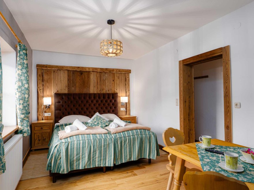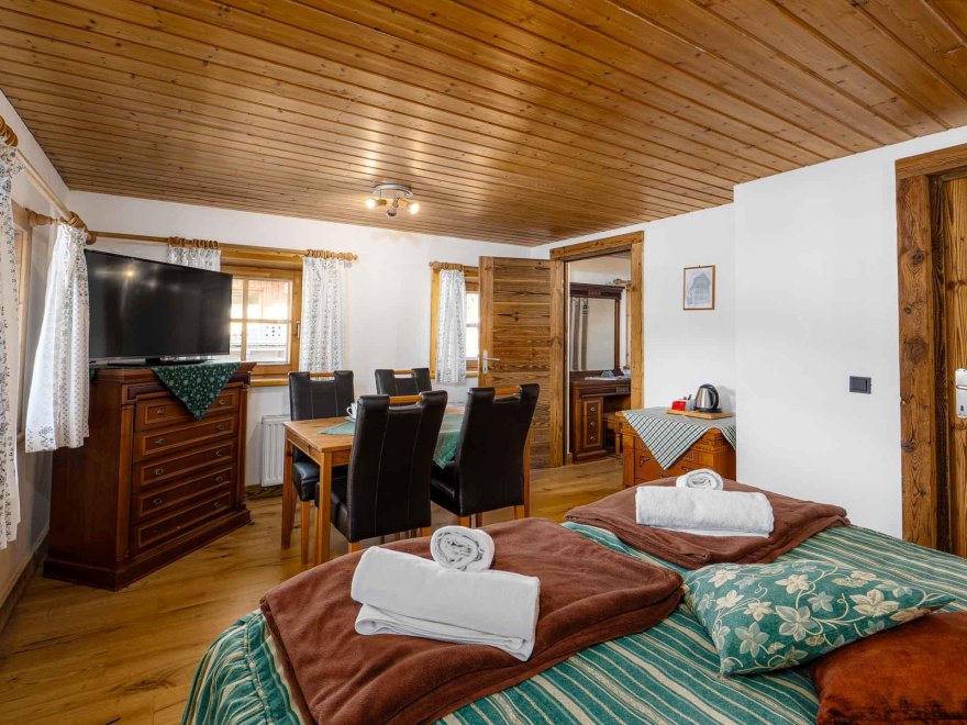 Zimmer mit Doppelbett, Zusatzbett, Tisch und Stühle, Dusche/Wc, Kabel-TV, Internetanschluss (W-LAN).