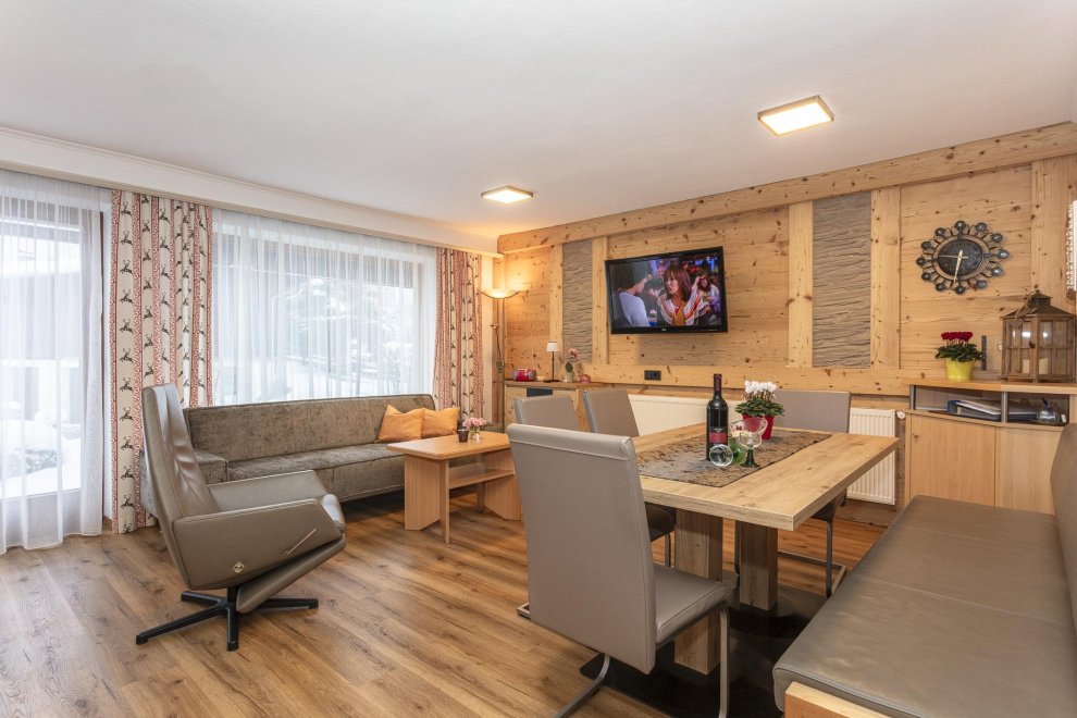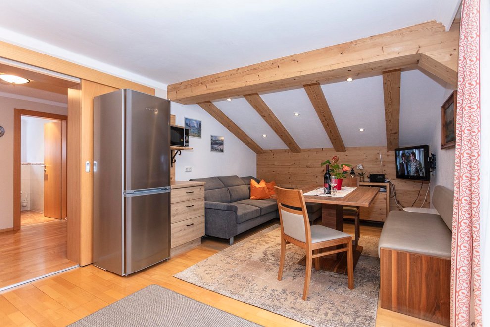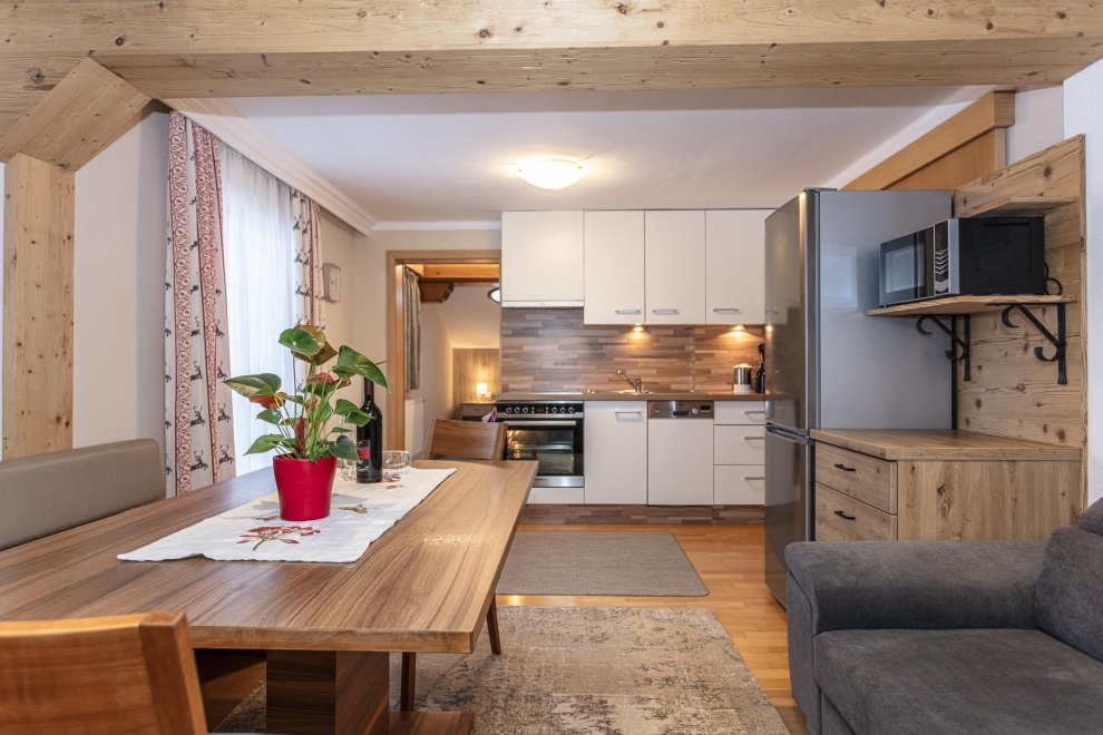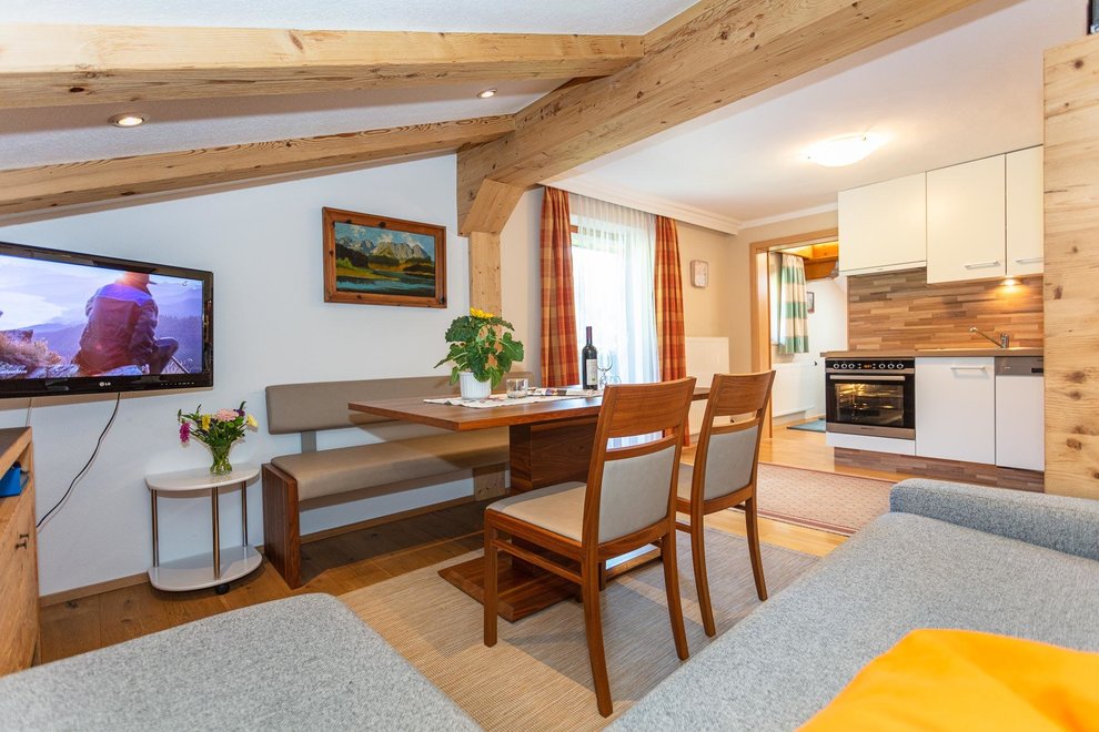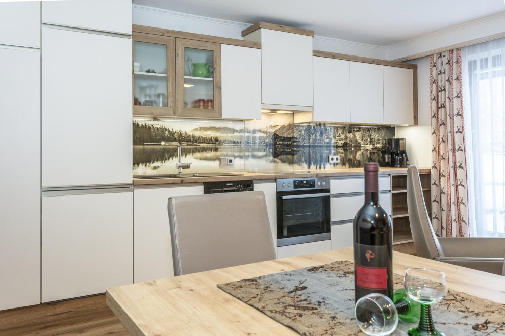 Helle, im modernen Stil ausgestattete Ferienwohnung für 2 bis 7 Personen mit geräumiger Wohnküche, Essplatz für 6 Personen, Komplettküche mit Vierplattenherd, Backrohr, Kühlschrank mit Gefrierfach, Geschirrspüler, Kaffeemaschine, Wasserkocher, Sat-TV, Radio mit CD-Player, Wohnlandschaft mit Ausziehcouch, 2 Dreibettzimmer jeweils mit Du/WC, Vorraum, 1 WC extra, Terrasse - Gesamt 70 m².