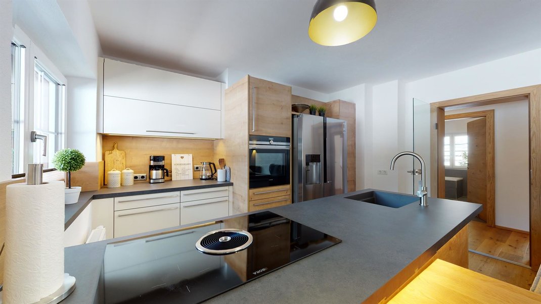 - Die offene Wohnküche mit Kochinsel ist der perfekte Ort, um gemeinsam zu kochen und zu genießen. Eine gemütliche Wohnlandschaft mit TV lädt zum Entspannen ein – hier fühlt sich jeder wohl.