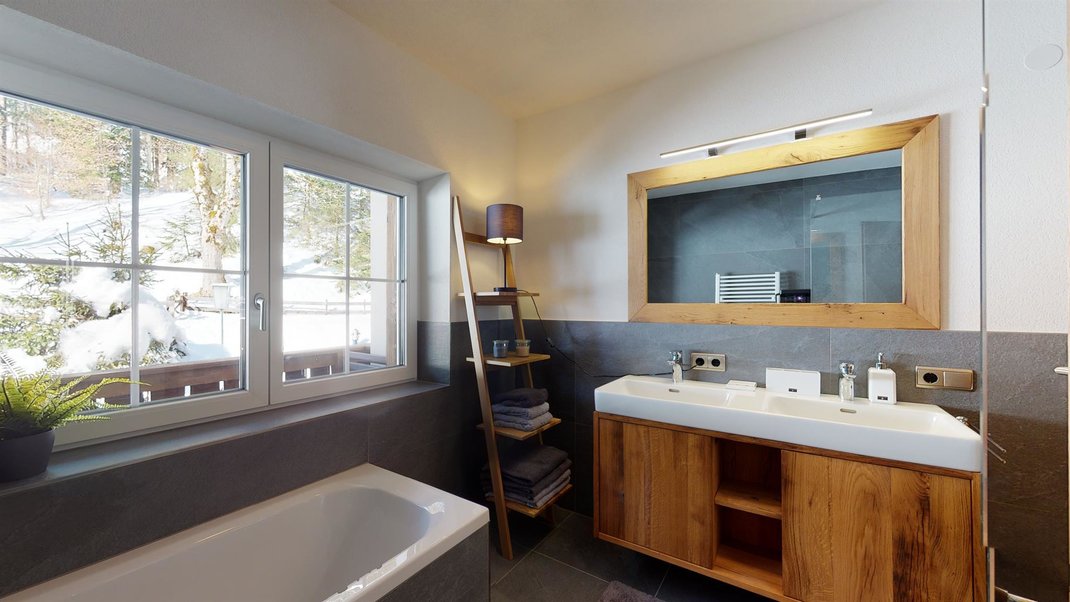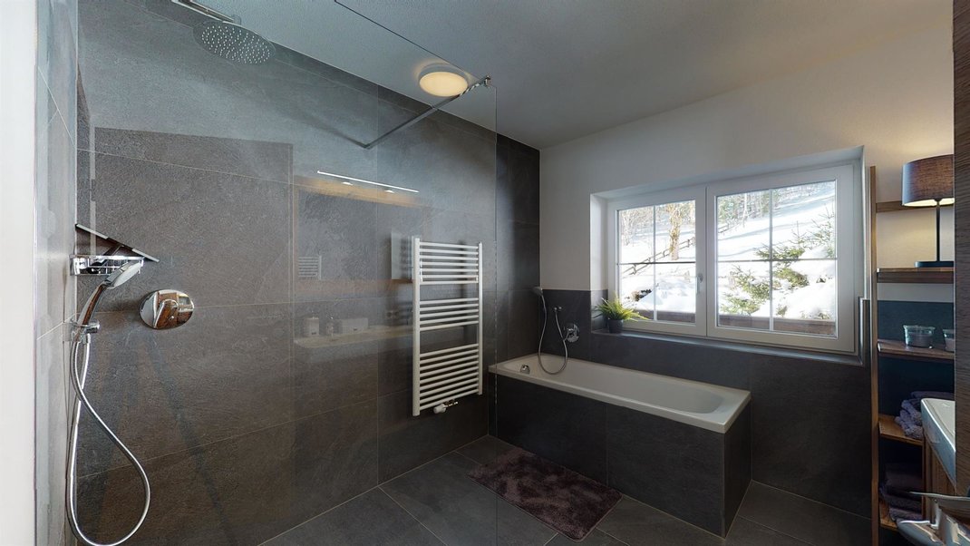 - Das Bad bietet mit Doppelwaschbecken, Badewanne und separater Dusche maximalen Komfort. Für zusätzliche Bequemlichkeit ist das WC separat untergebracht.