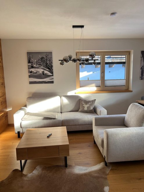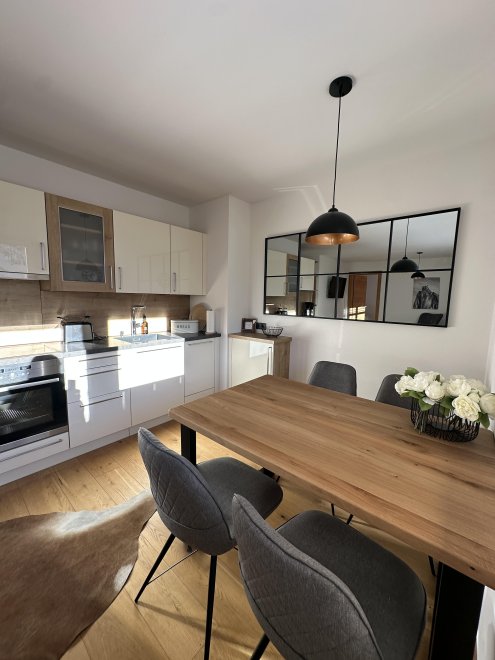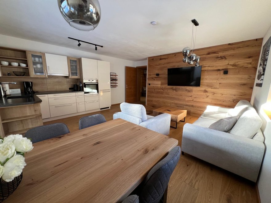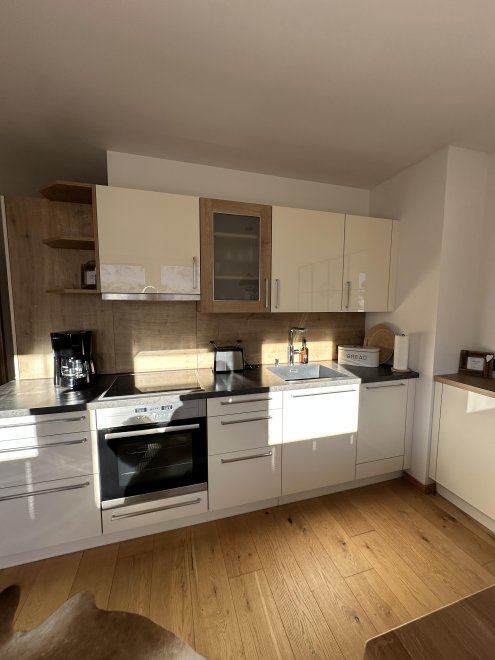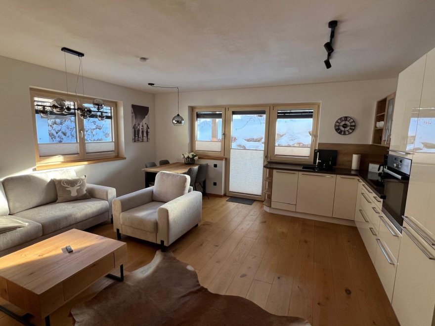 - Die offene Wohnküche ist der perfekte Ort, um gemeinsam zu kochen und zu genießen. Eine gemütliche Wohnlandschaft mit Schlaffunktion und TV lädt zum Entspannen ein - hier fühlt sich jeder wohl. Der Zugang zu einer großen sonnigen Terrasse mit einem herrlichen Blick auf die umliegende Bergwelt und ins Grüne macht das Appartement perfetkt.