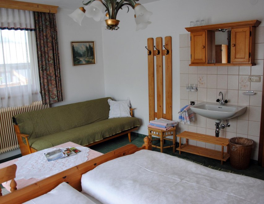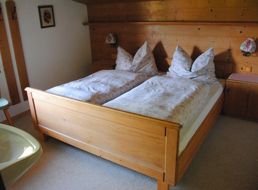 Neu möbeliertes Doppelzimmer mit Zusatzbett und Balkon, Teppichboden und rustikaler Einrichtung, Dusche/WC auf Etage.