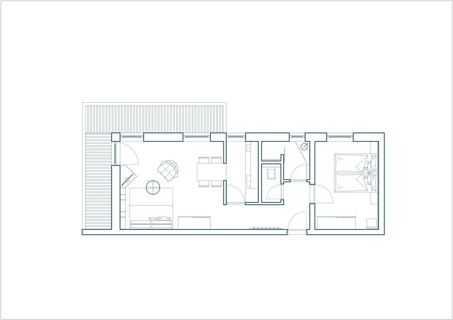 verdeckbare Küchenzeile mit gegenüberliegendem Essplatz, kleiner Flur mit Garderobe, sowie Terrasse zur Westseite, Holzboden