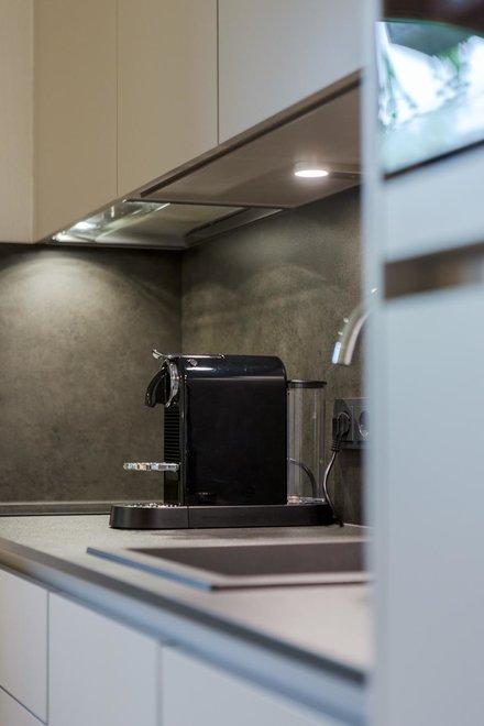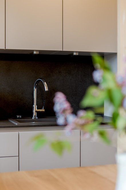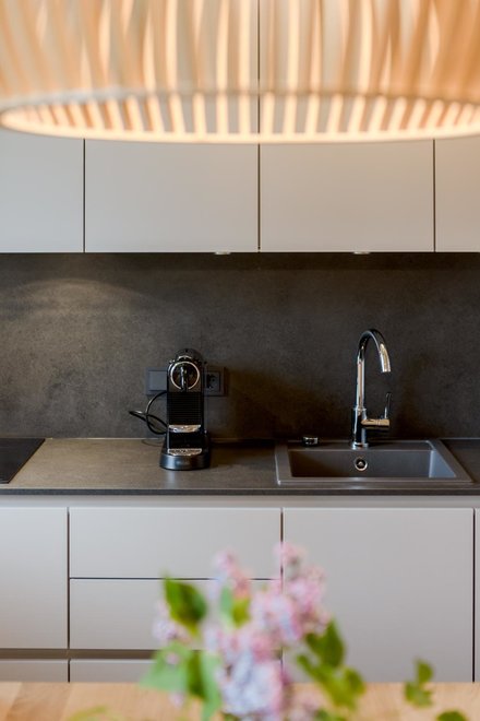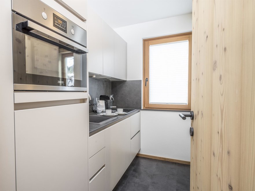 abgeschlossene Küche mit grossem Schiebefenster zum Essplatz,