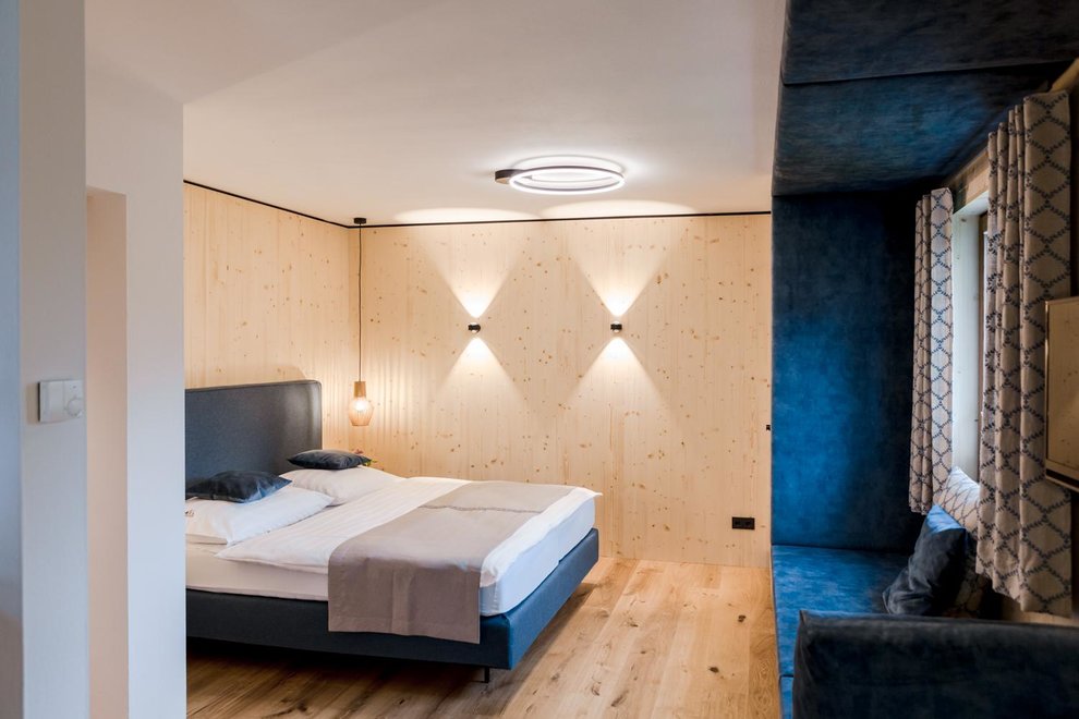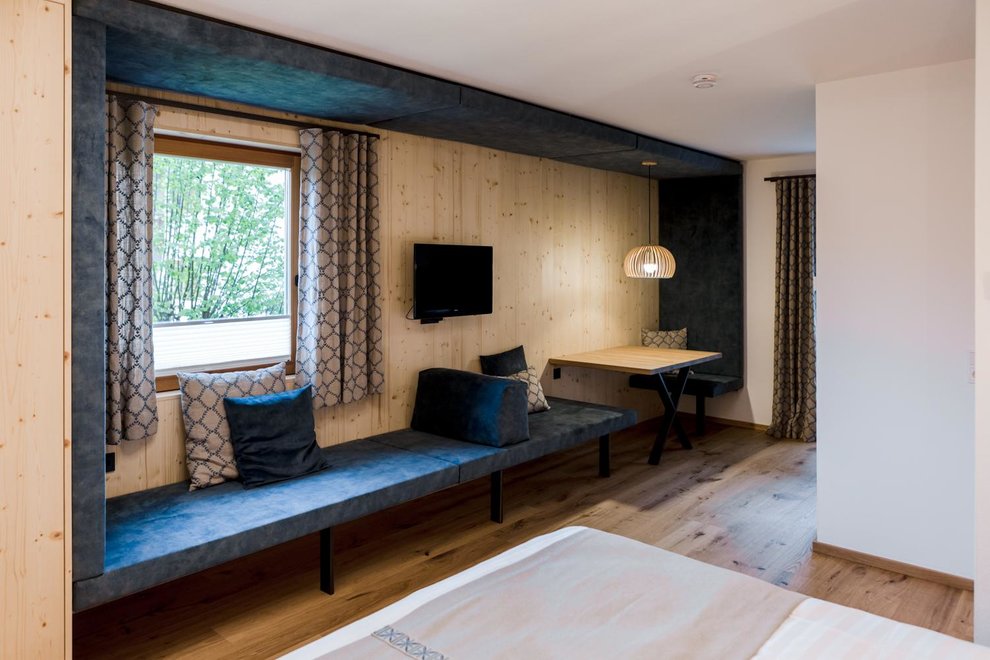 Gemütlicher Wohn-Schlafraum mit Doppelbett und Sitzplatz,