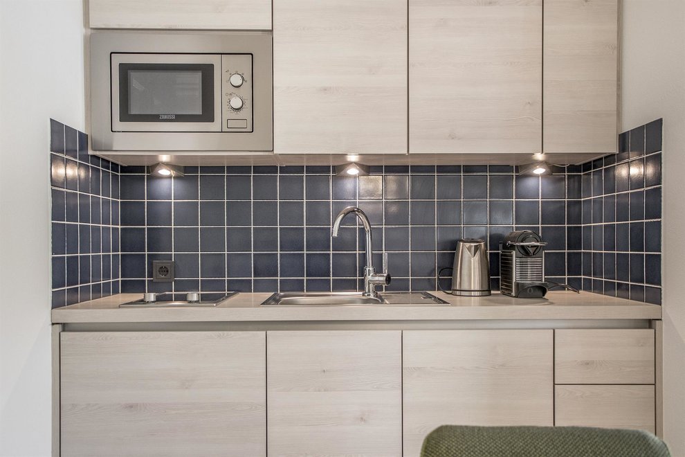 1 Wohnschlafzimmer mit Doppelbett, Badezimmer mit Dusche, WC teilweise separat, Küchenzeile, kleiner Flur mit Garderobe