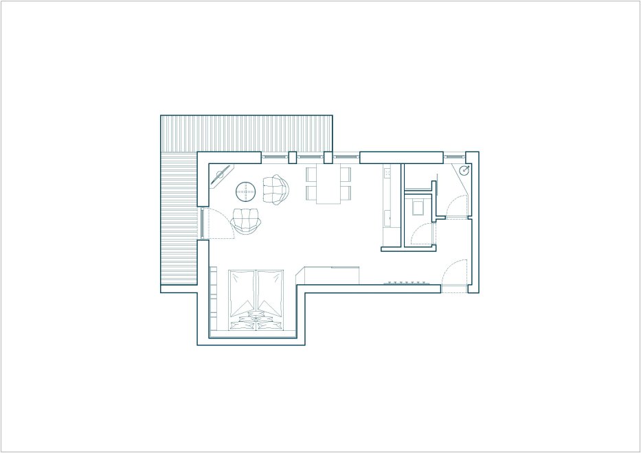 1 Wohn-Essraum mit bequemer Schlafcouch in Doppelbettqualität für 1-2 Personen, abgeschlossene Küche mit grossem Schiebefenster zum Essplatz,