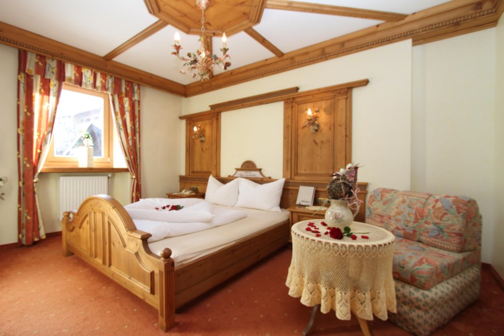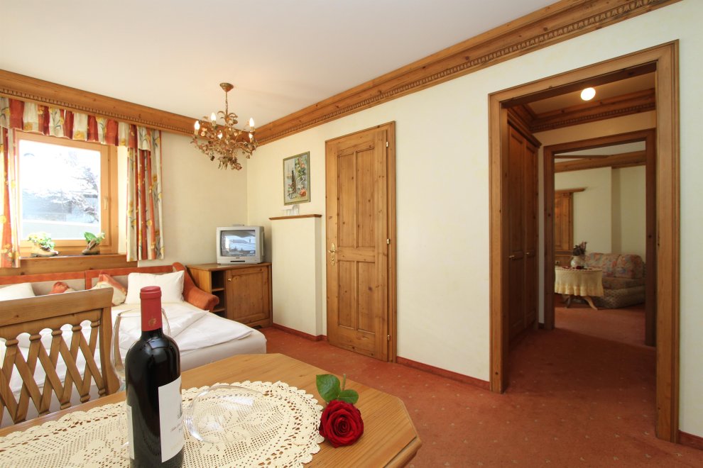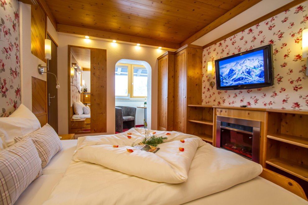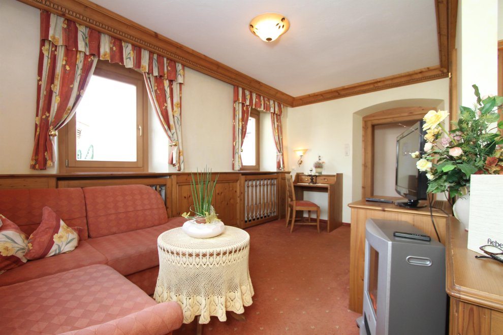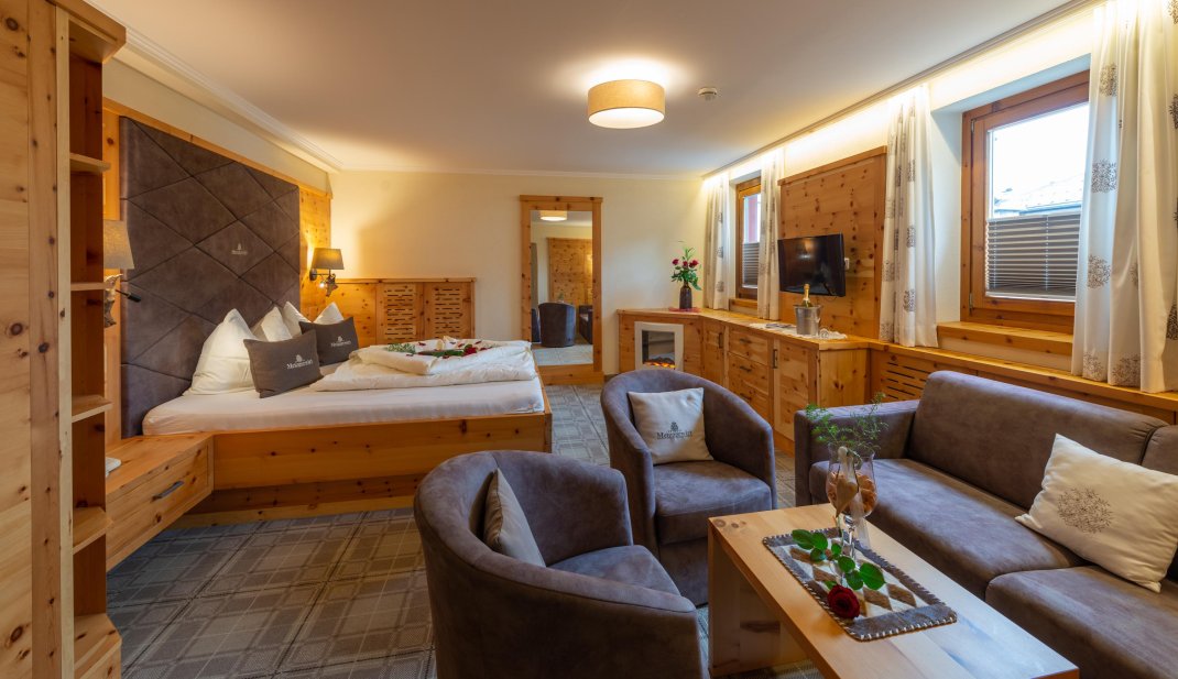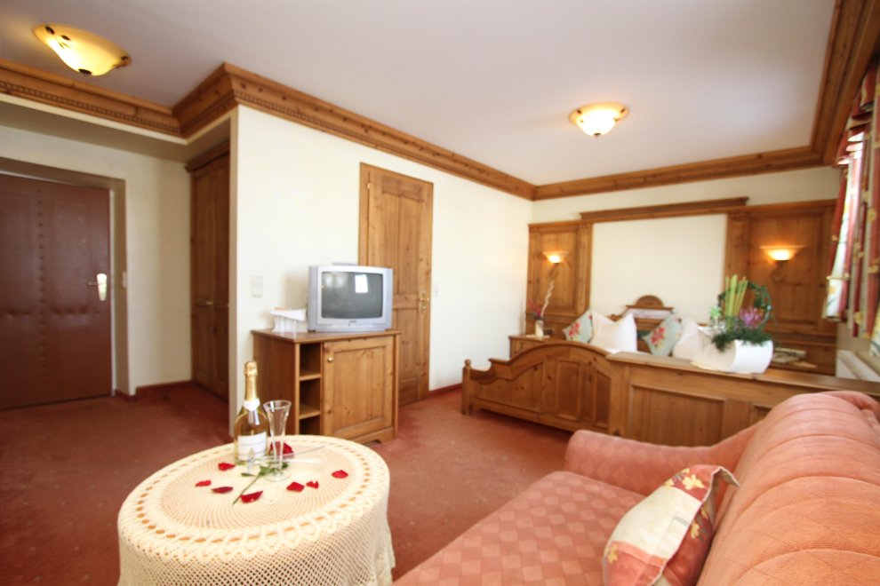 2 Schlafbereiche mit einem Durchgang (Rundbogen), Doppelbett, Doppel-Ausziehcouch, Dusche, Wc extra, Sitzecke, Radio, Kabel-TV, Minibar, Zimmersafe, Balkon, rustikale Möblierung (Zirbenholz).