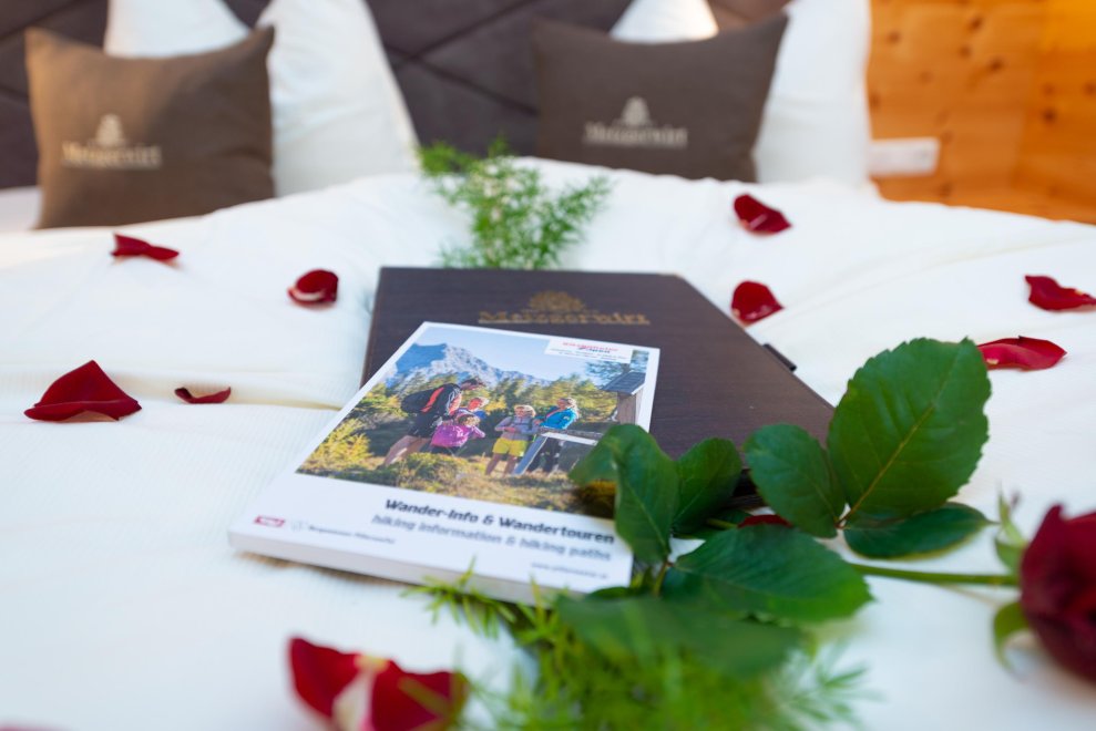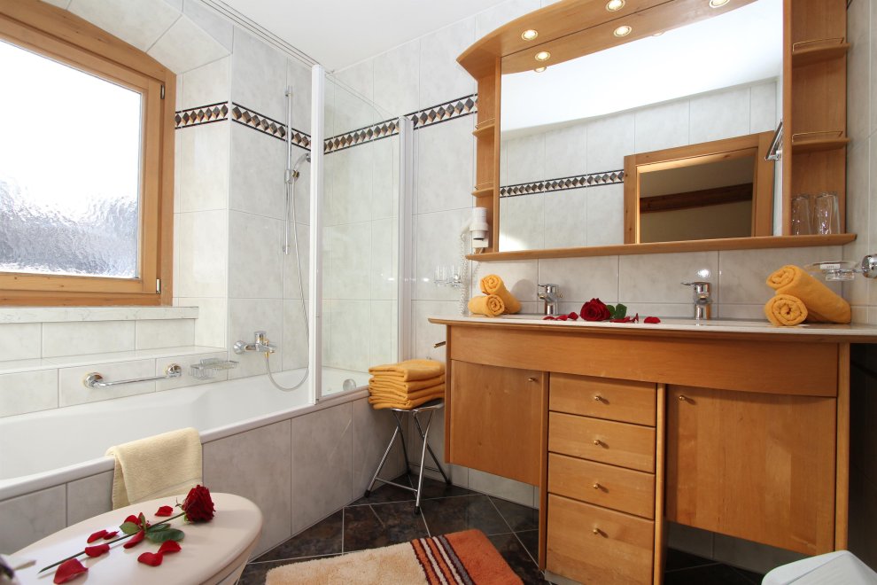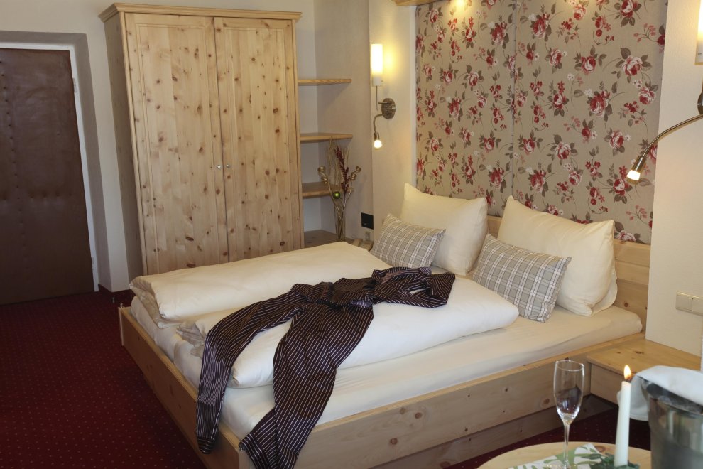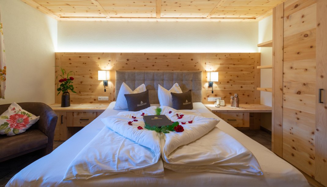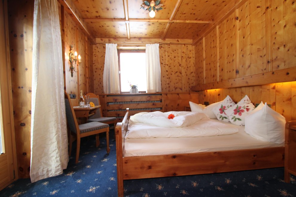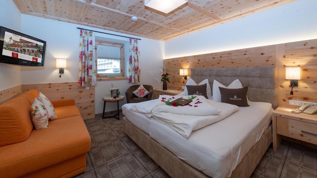 2 Schlafbereiche mit einem Durchgang (Rundbogen), Doppelbett, Doppel-Ausziehcouch, Dusche, Wc extra, Sitzecke, Radio, Kabel-TV, Minibar, Zimmersafe, Balkon, rustikale Möblierung (Zirbenholz).
