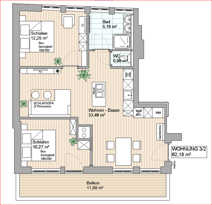Anzahl Doppelbett/en: 2, Ausziehbare Couch, max. Pers.: 2