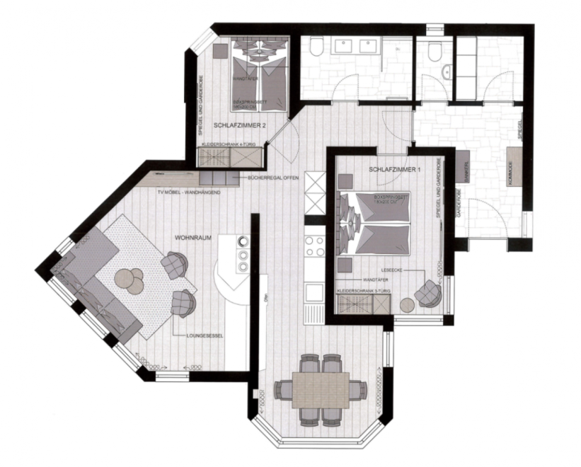 Ausstattung: 2 Schlafzimmer mit Doppelbett, Wohn-Schlafzimmer mit Doppelausziehcouch, Komplett ausgetstattete Küche mit Essplatz: Mikrowelle, Geschirrspüler, 4-Platten-Herd, Kühlschrank, Kaffeemaschine,Toaster, Wasserkocher. Dusche und WC getrennt, Bettwäsche, Hand- und Küchentücher, Koch- und Essgeschirr sowie Gläser, TV, Radio, Safe, Föhn, Vorraum und Skischuhtrockner