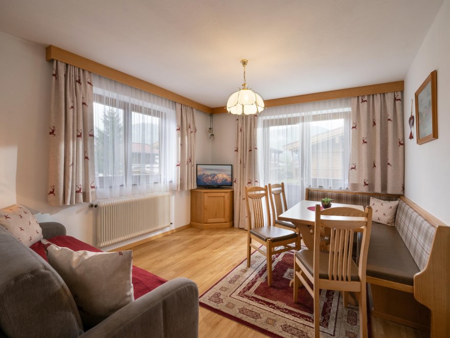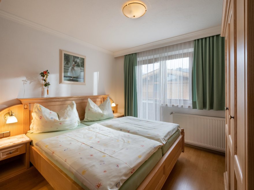 Die komfortable Wohnung verfügt über eine gut ausgetattete Küche, ein gemütliches Wohnzimmer mit Schlafmöglichkeit und ein geräumiges Schlafzimmer mit Dusche und WC. Einen herrlichen Panoramablick auf die umliegende Bergwelt bietet der sonnige Balkon. Auf Wunsch kann ein weiteres Doppelzimmer mit Dusche und WC dazugebucht werden.