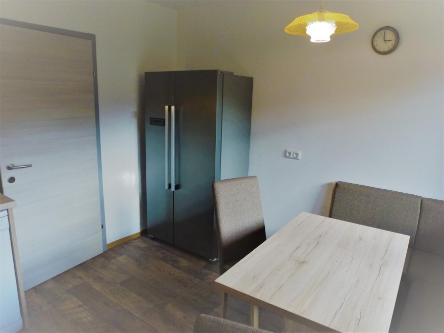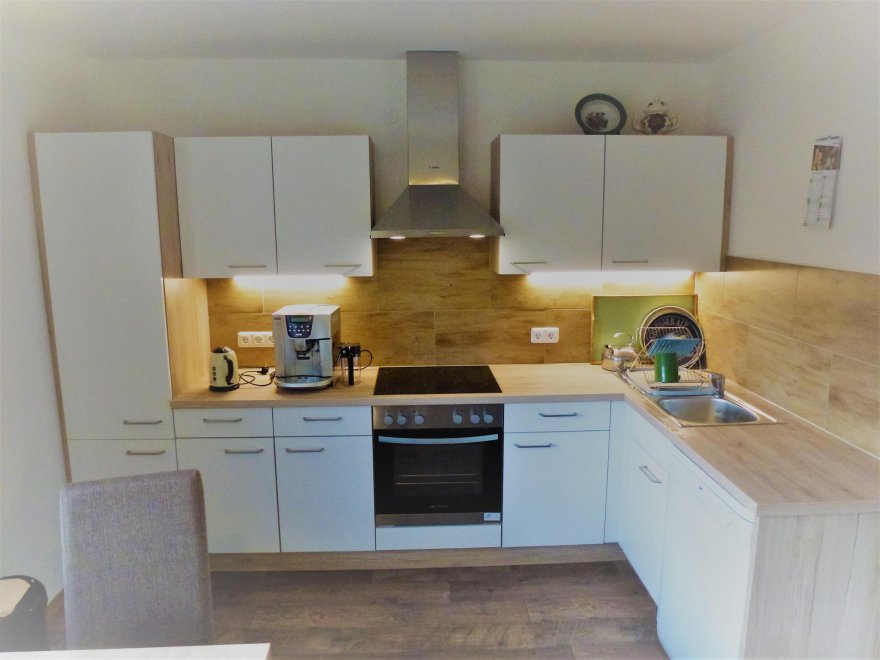 Neuwertige Ferienwohnung im Parterre mit 1 Schlafzimmer mit Doppelbett und 1 Schlafzimmer mit Doppelbett und Stockbett, Du/WC, Wohnküche mit Essecke, Sat-TV, Terrasse. Da die Wohnung komplett nach Süden ausgerichtet ist haben wir viel Tageslicht und natürlich die Sonne auch im Winter.