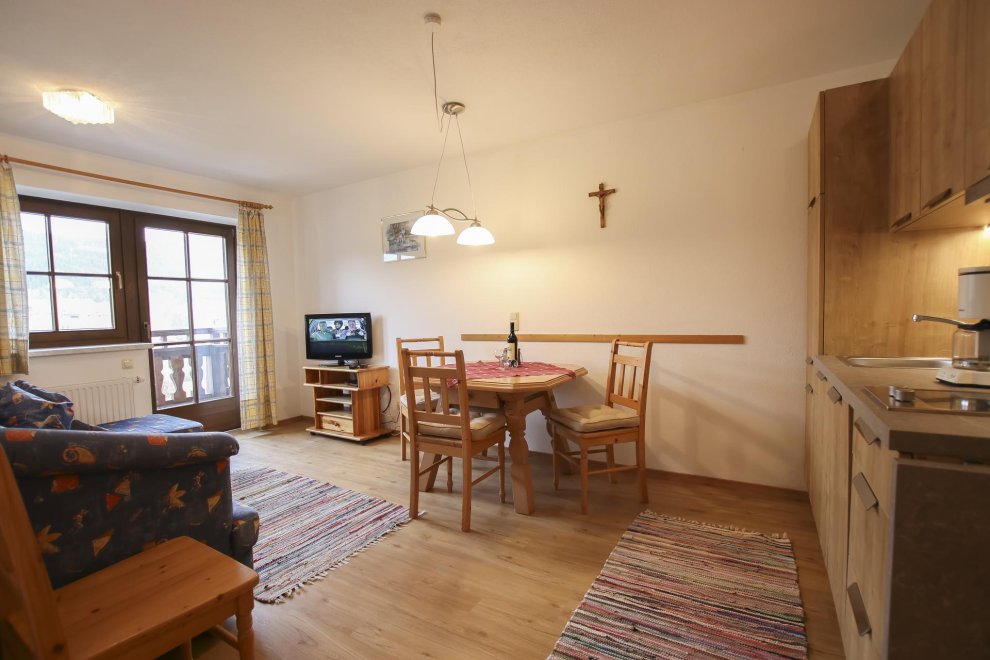 1 Schlafzimmer mit Doppelbett und zwei Einzelbetten, Wohnküche, Kochnische mit Geschirrspülmaschine, Essplatz, Bad/Wc, Balkon, TV, rustikale Möblierung, 45 m² Wohnfläche.