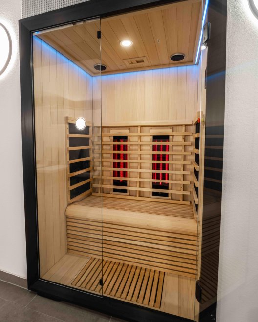 This deluxe penthouse apartment with 3 bedrooms can accommodate up to 6 people. All bedrooms have a double bed with en-suite bathroom. One bathroom also has an infrared cabin.