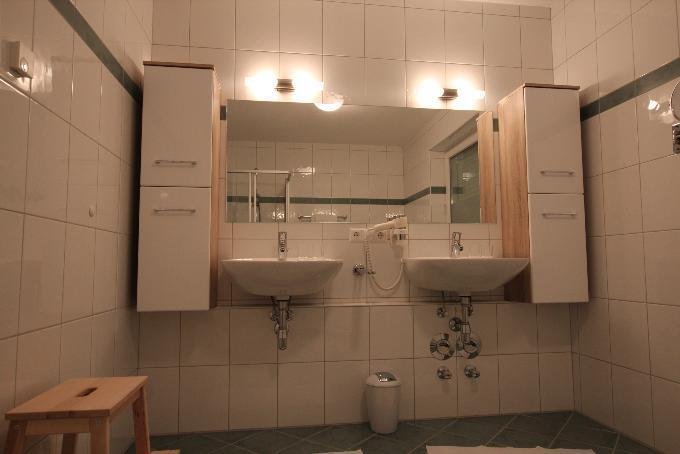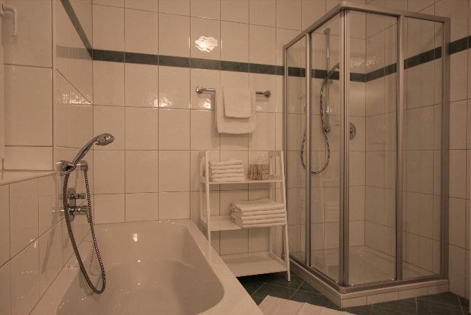shower, no. of bathrooms: 1, bathtub, no. of toilets: 1, running hot/cold water, bath, wash stand, double sink, separate toilet