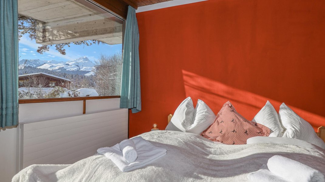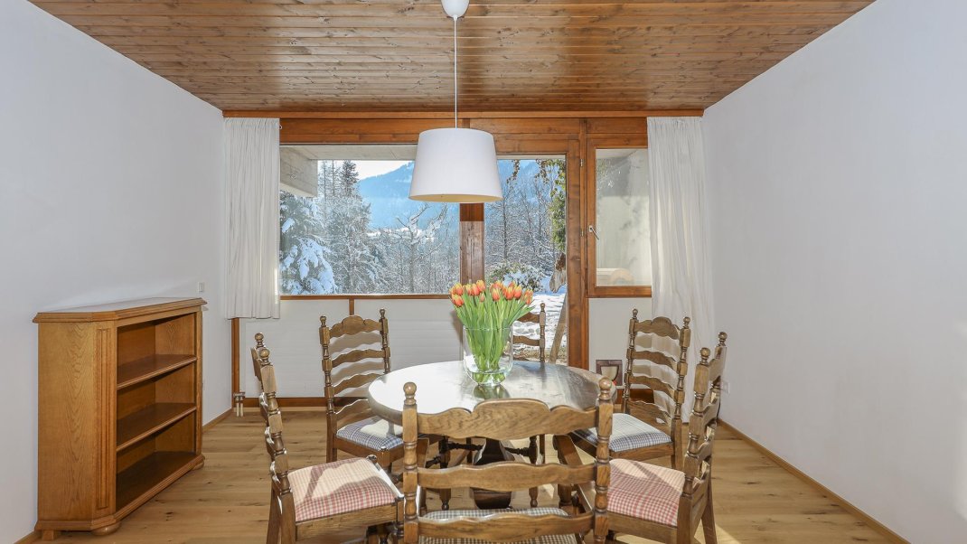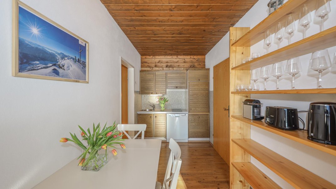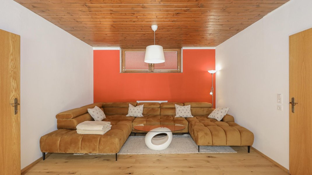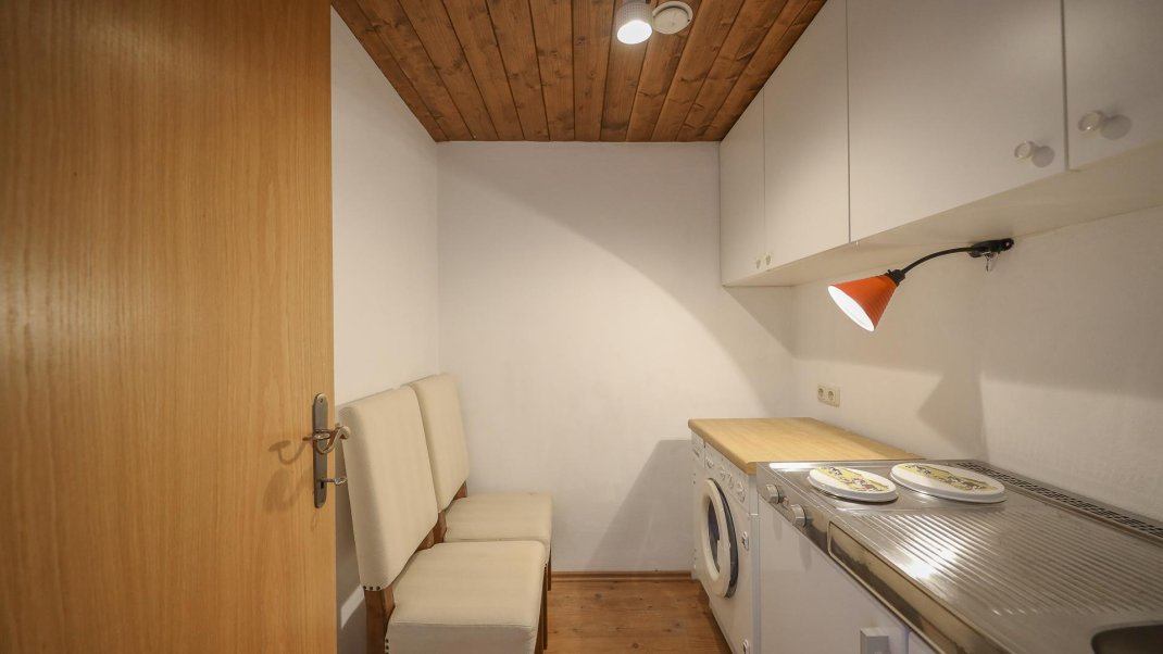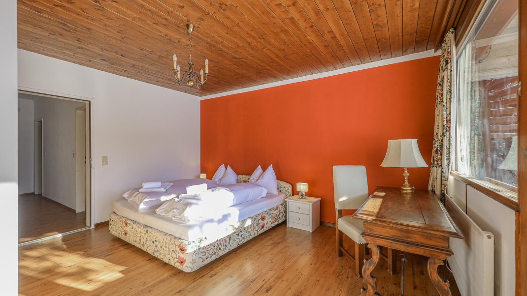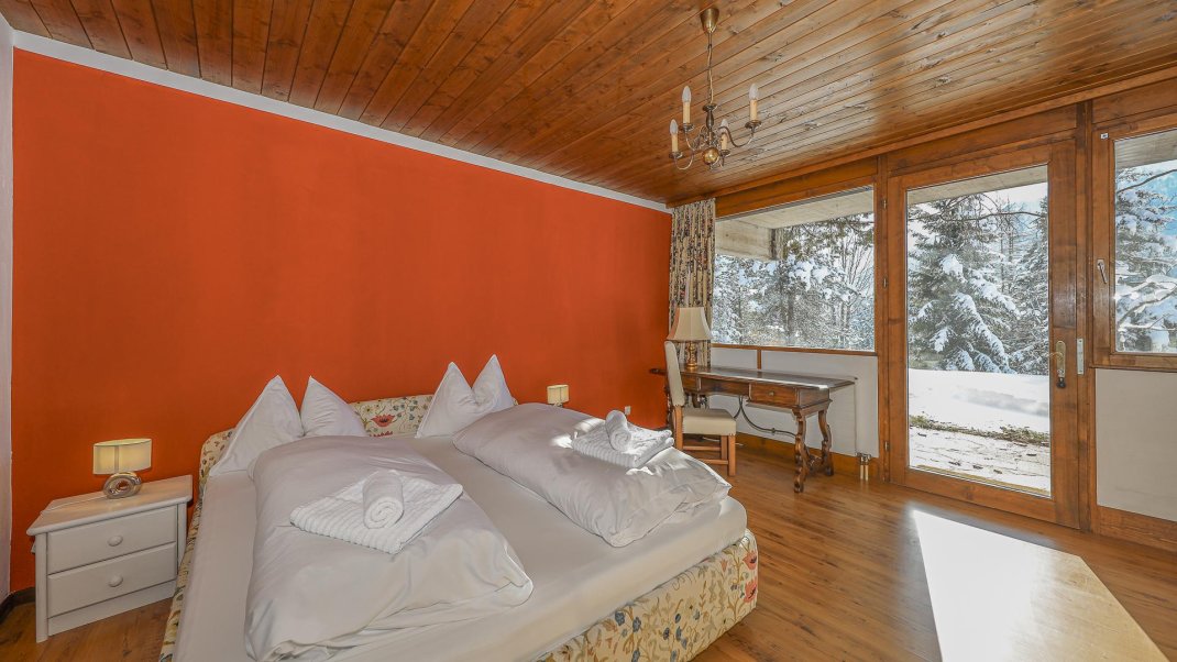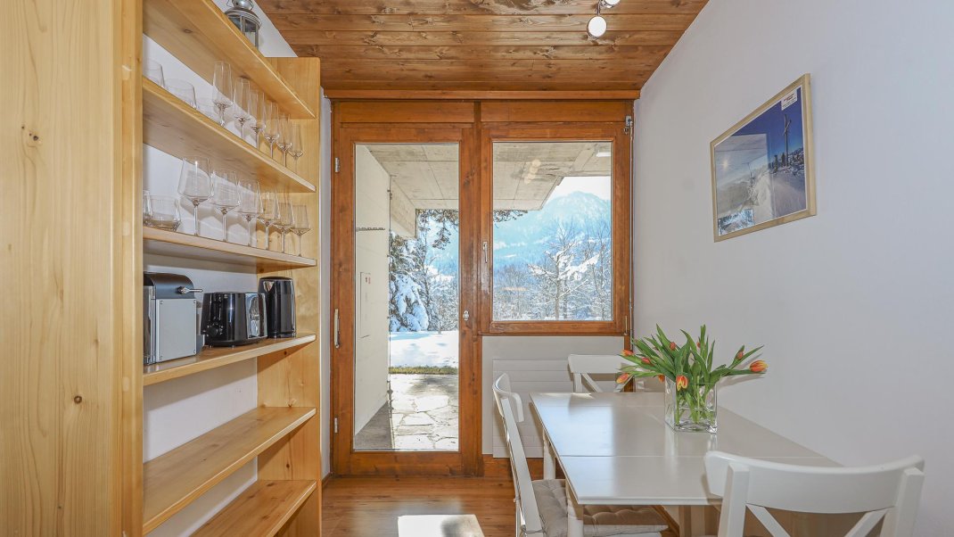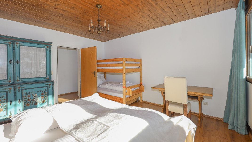 The flat is located on the ground floor of a detached house and has two bedrooms. One of the bedrooms is furnished with a king-size bed, while the other has both a king-size bed and a bunk bed. The spacious living room invites you to linger with a picturesque view of the mountains. The fully equipped kitchen invites you to cook and eat together. A washing machine and ironing facilities are also available. The large garden also offers a relaxing atmosphere and invites you to linger.